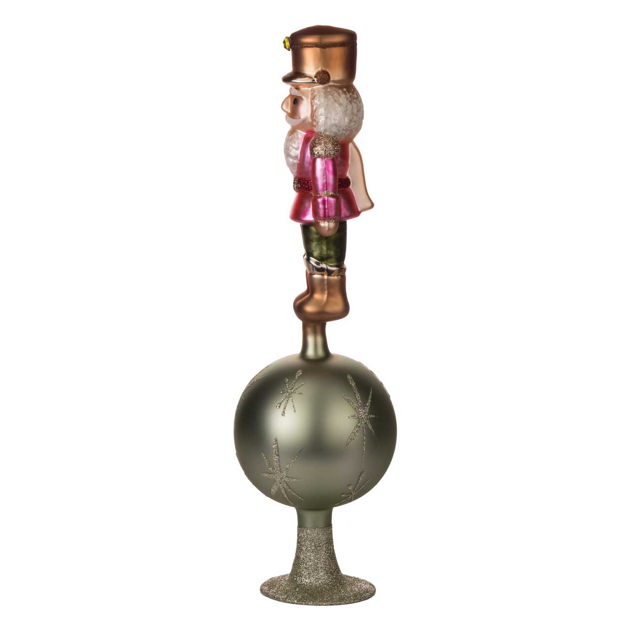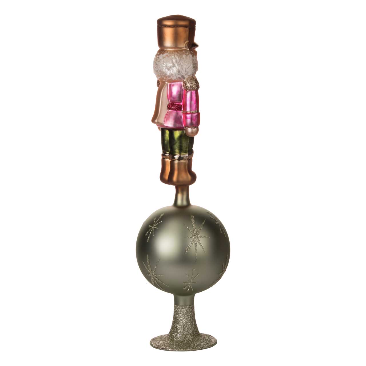 Questa versione mostra uno schiaccianoci in rosa e verde brillante, in trono su una grande palla d'oro opaco con motivi di stelle scintillanti. La sua gonna uniforme, decorata con dettagli scintillanti, contrasta efficacemente con i colori caldi degli stivali e del berretto. La figura ha un design allungato e imponente, mentre la palla come base conferisce all'insieme un equilibrio armonioso. Un gioiello di grande effetto che cattura immediatamente l'attenzione.