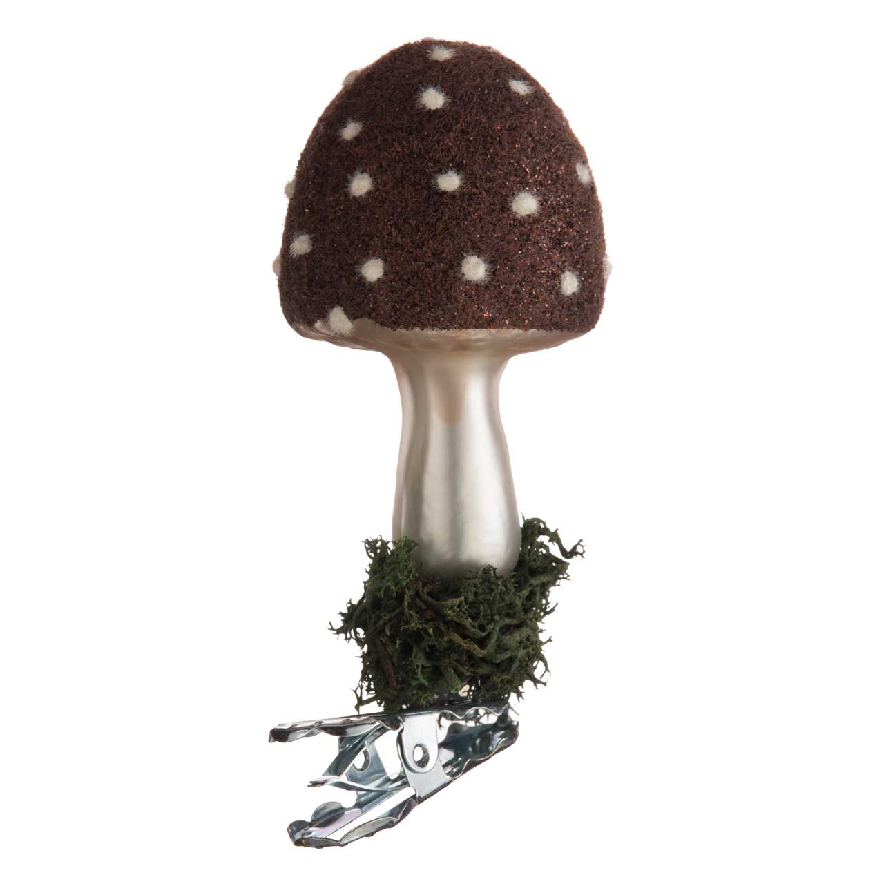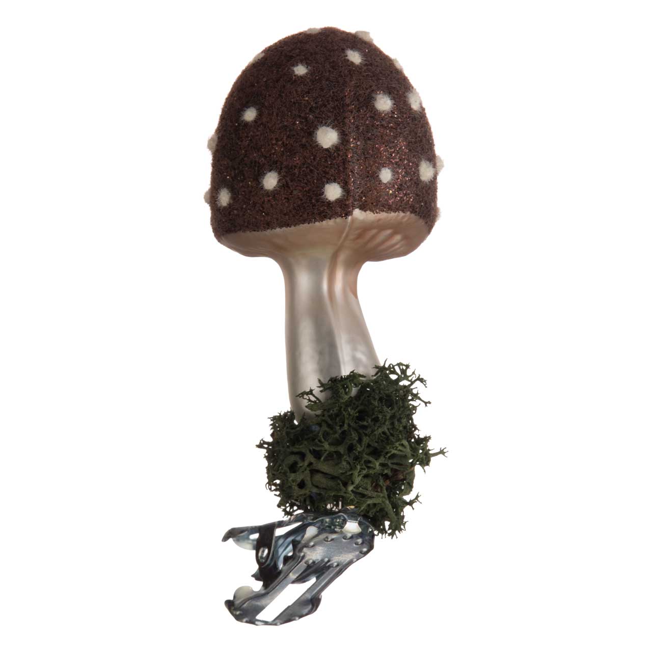 Questa versione presenta un agarico muscario marrone con una superficie finemente strutturata, punti bianchi e un gambo setoso e scintillante. La base è decorata con vero muschio, che conferisce al design un carattere naturale e autentico. La combinazione di marrone opaco, caldo bianco perla e delicati glitter crea un'eleganza armoniosa e terrena.