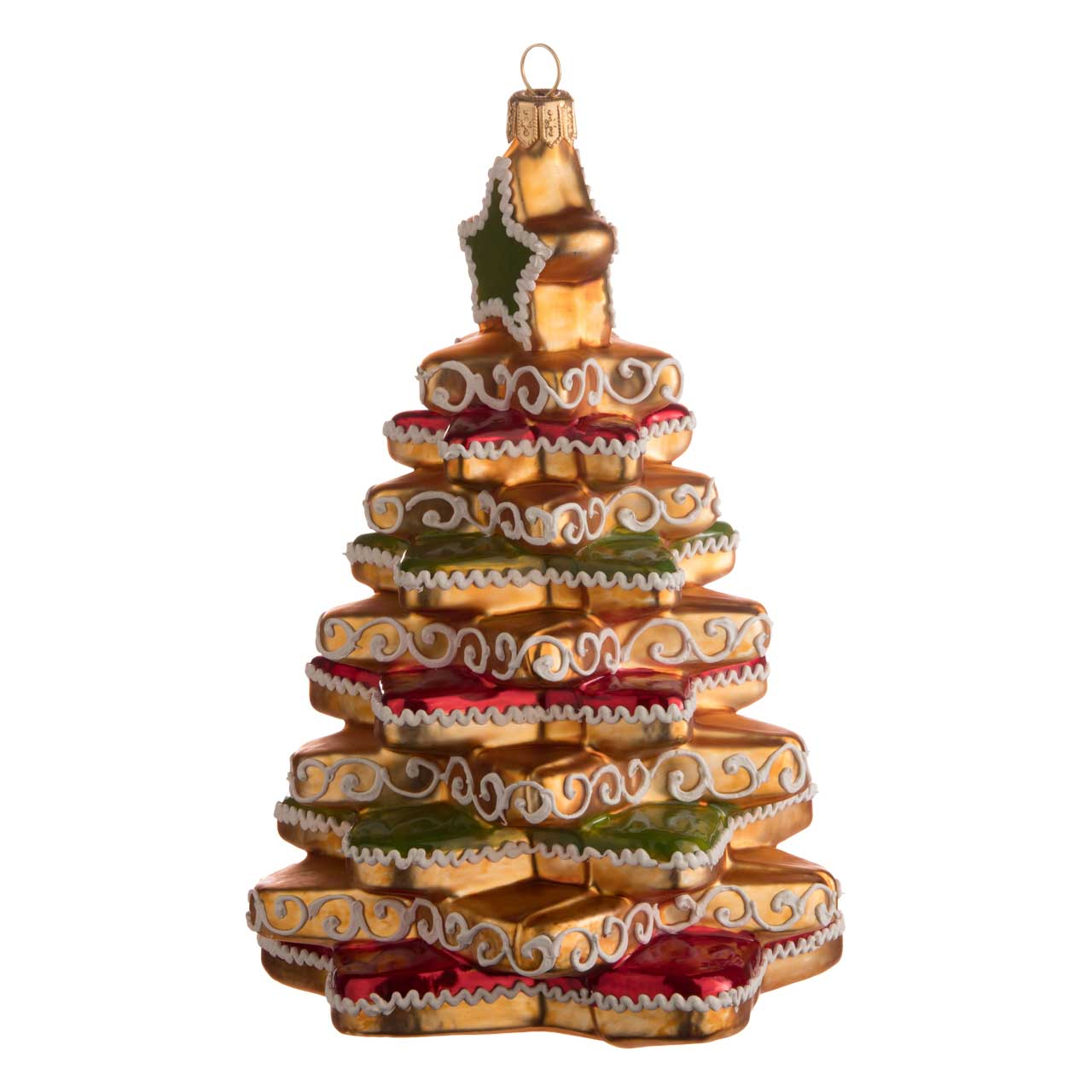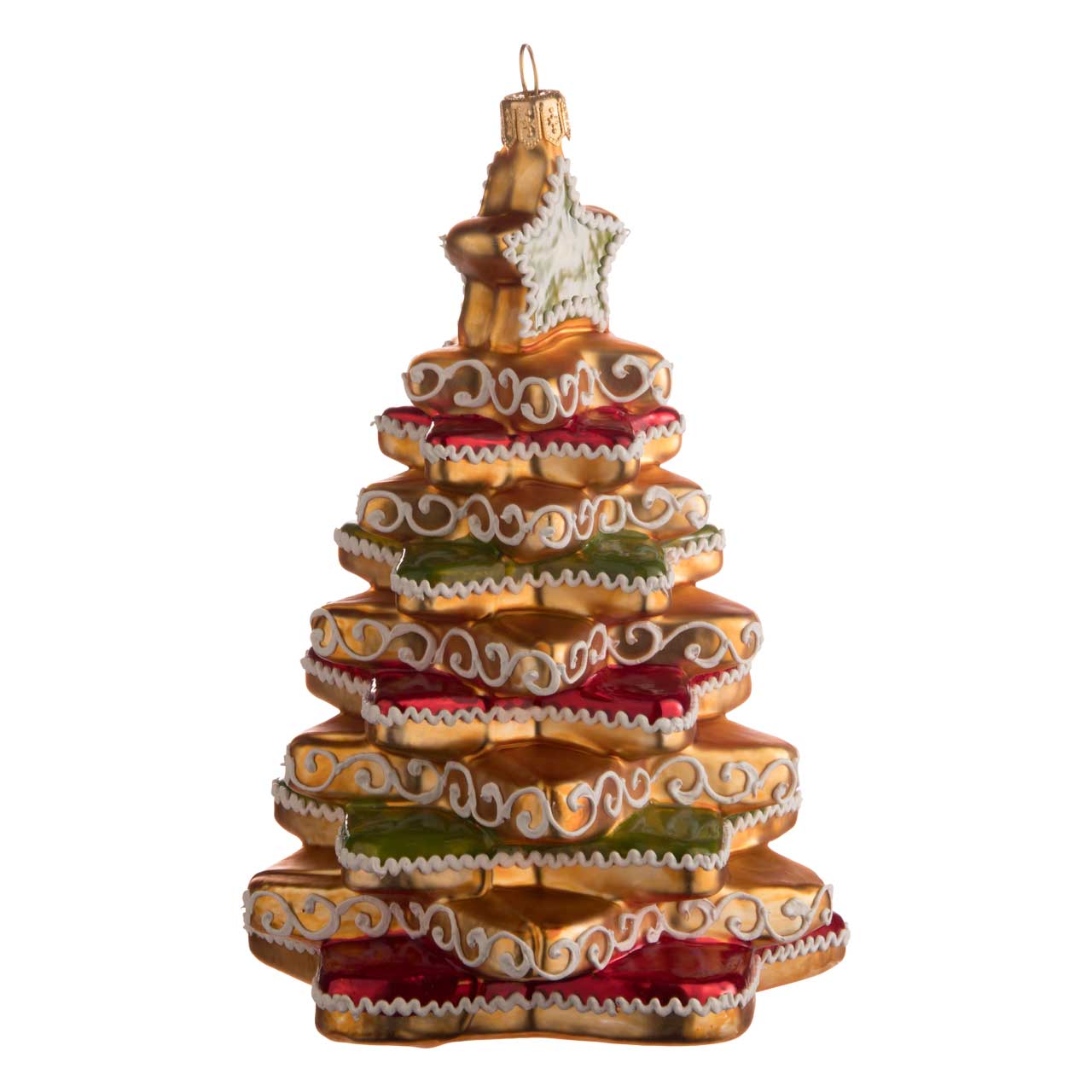 Dieci stelle a cinque punte sfalsate sono state impilate una sull'altra, dalla più grande in basso alla più piccola in alto. Oltre al colore marrone pan di zenzero opaco della parte superiore, ogni seconda stella è stata dipinta di verde o rosso come se fosse una glassa. E proprio come un vero albero di Natale, una piccola stella verde posizionata verticalmente è stata collocata in cima come coronamento dell'albero di Natale.