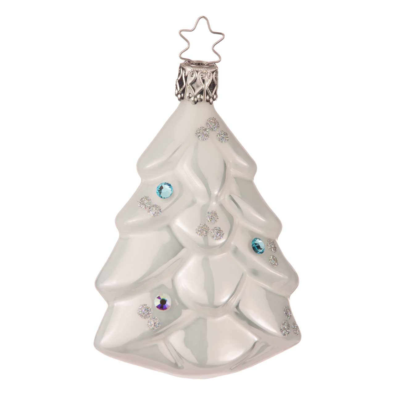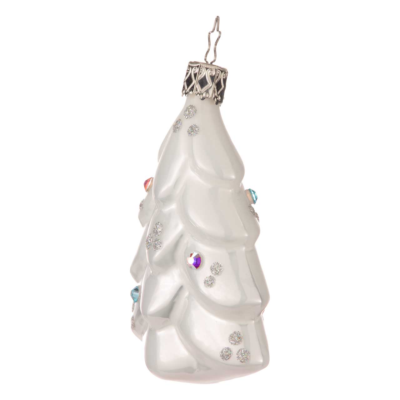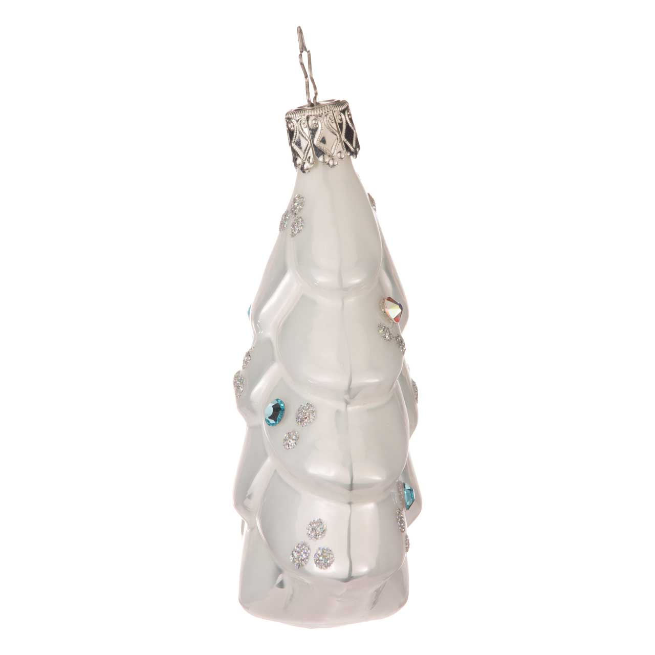 Il gingillo presenta un abete stilizzato con una lucentezza bianca perlacea. I rami curvi sono decorati con scintillanti accenti di glitter argento e diverse gemme blu che sembrano piccoli cristalli di ghiaccio. La forma è piatta e chiaramente strutturata, il che fa risaltare particolarmente bene l'elegante motivo.