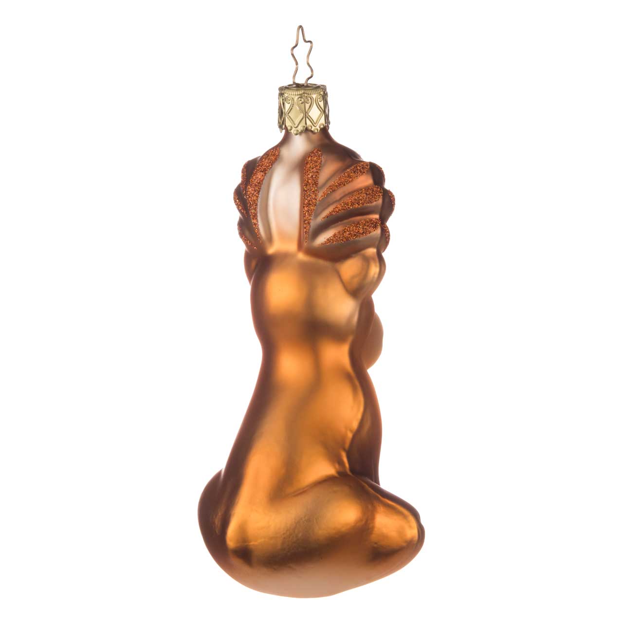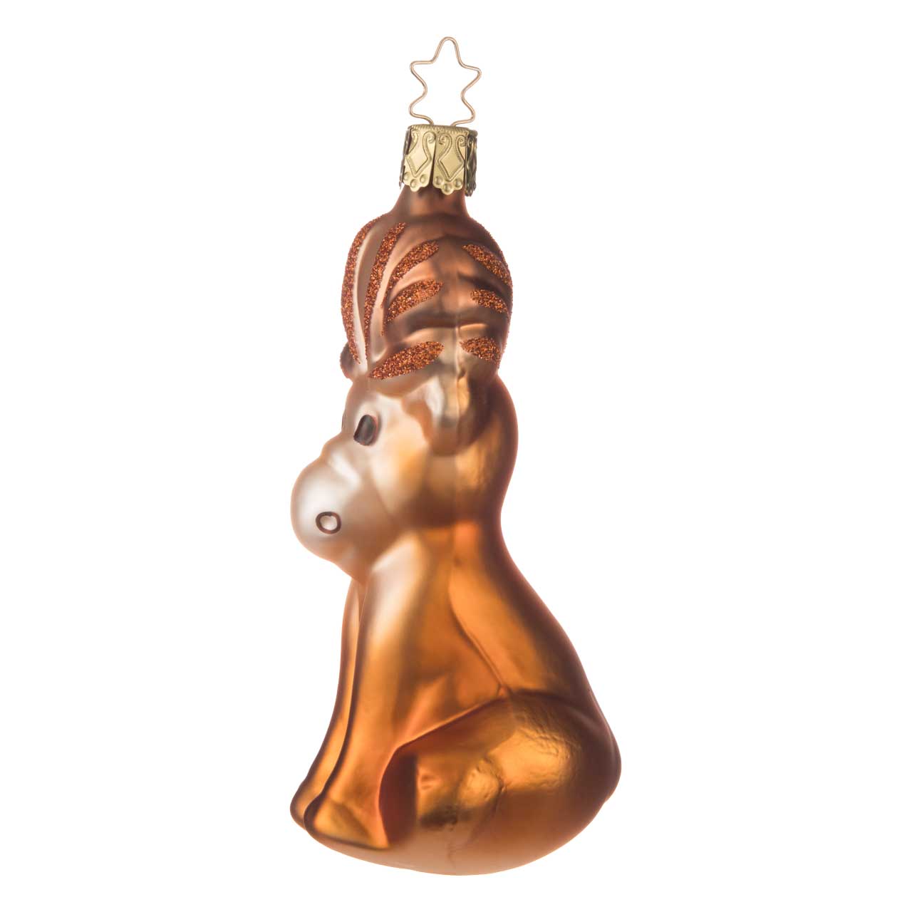 La figura mostra un alce seduto in un caldo color bronzo con superficie lucida. Le corna dettagliate, decorate con accenti scintillanti, sono particolarmente suggestive. La forma è allungata, con contorni arrotondati che sottolineano il carattere gentile dell'animale. L'espressione amichevole rende questo motivo un affascinante richiamo visivo.