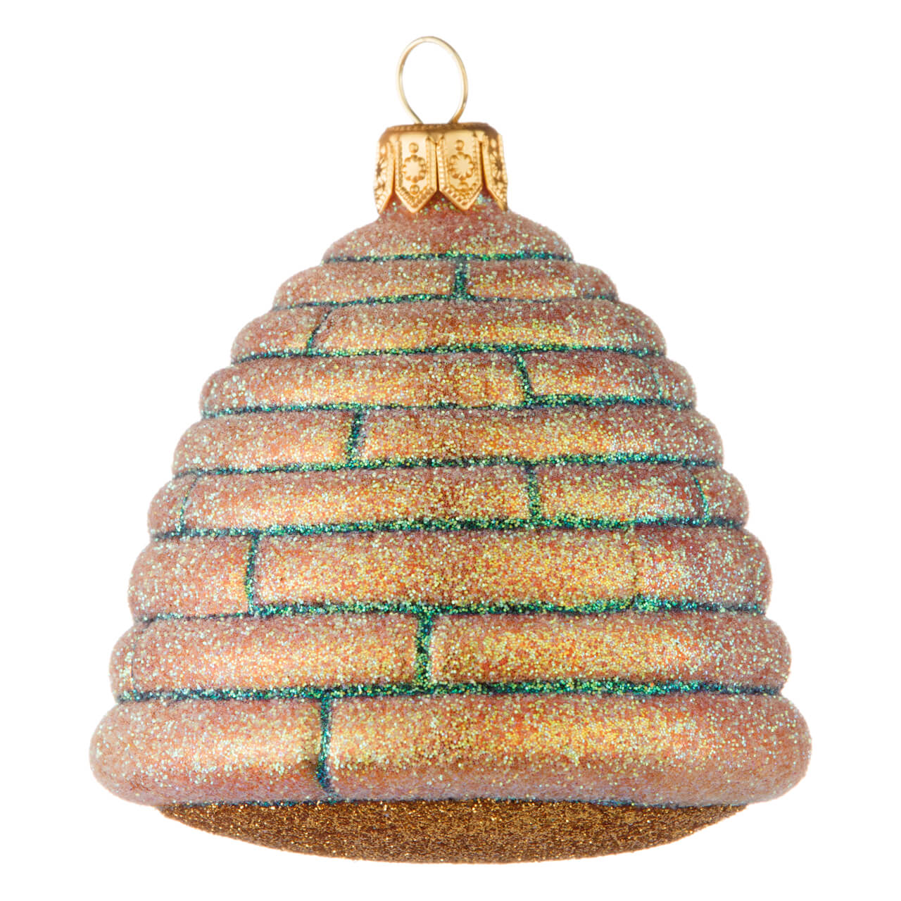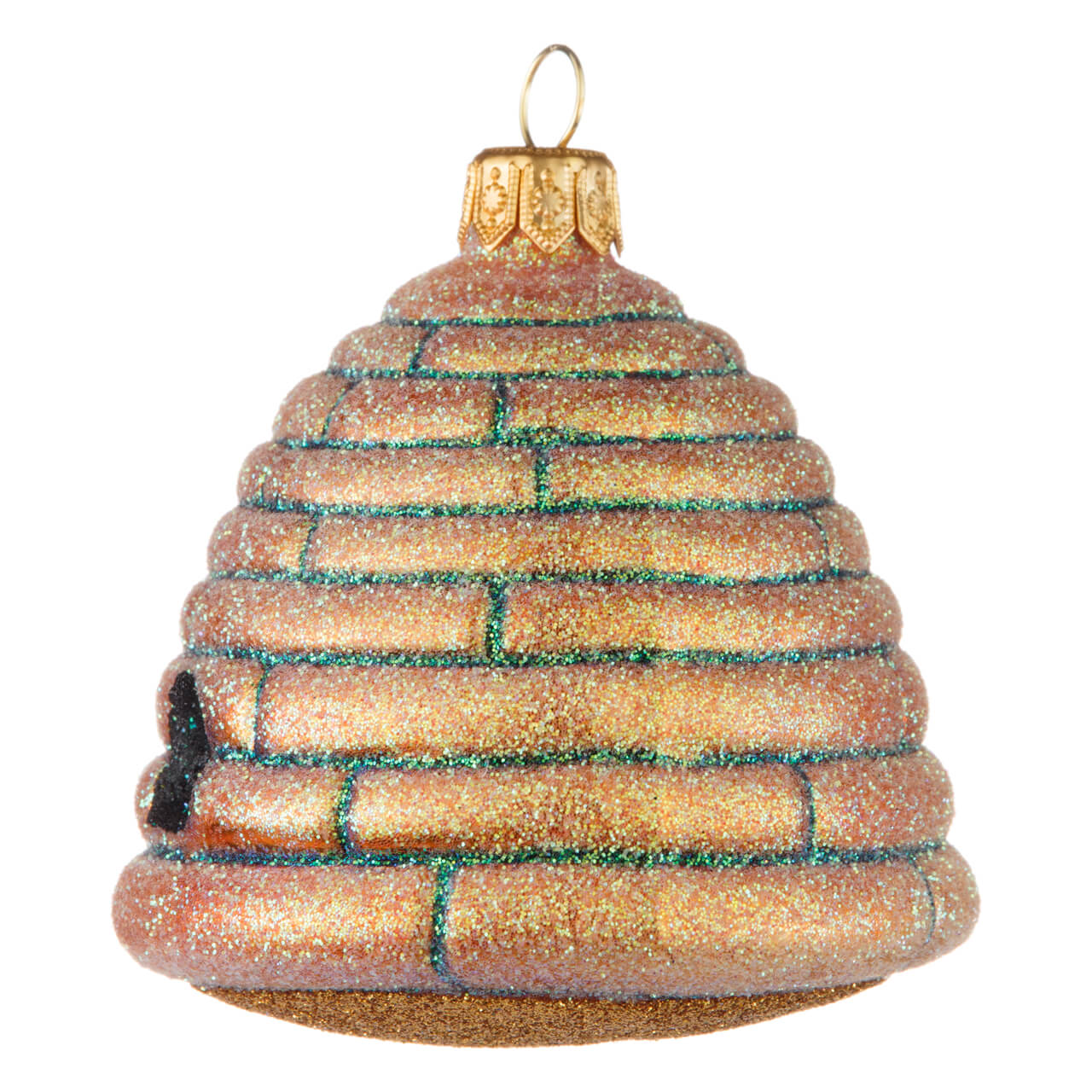 L'alveare, che ha la forma di una classica cupola, è stato dapprima dipinto di giallo oro con contorni nero-verdi e poi, in un secondo momento, è stato scintillato con diverse tonalità di glitter. Il foro d'ingresso scintilla di nero, i contorni brillano di verde e il cesto di paglia è giallo oro. E la parte inferiore? Crea un vero effetto wow con il suo colore oro chiaro. Per fare una figura perfetta da tutti i lati, anche ad altezze elevate sull'albero di Natale.