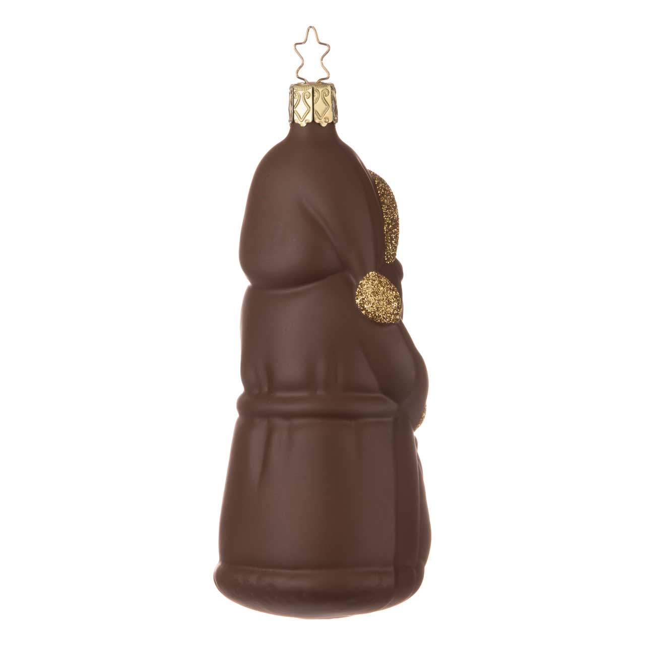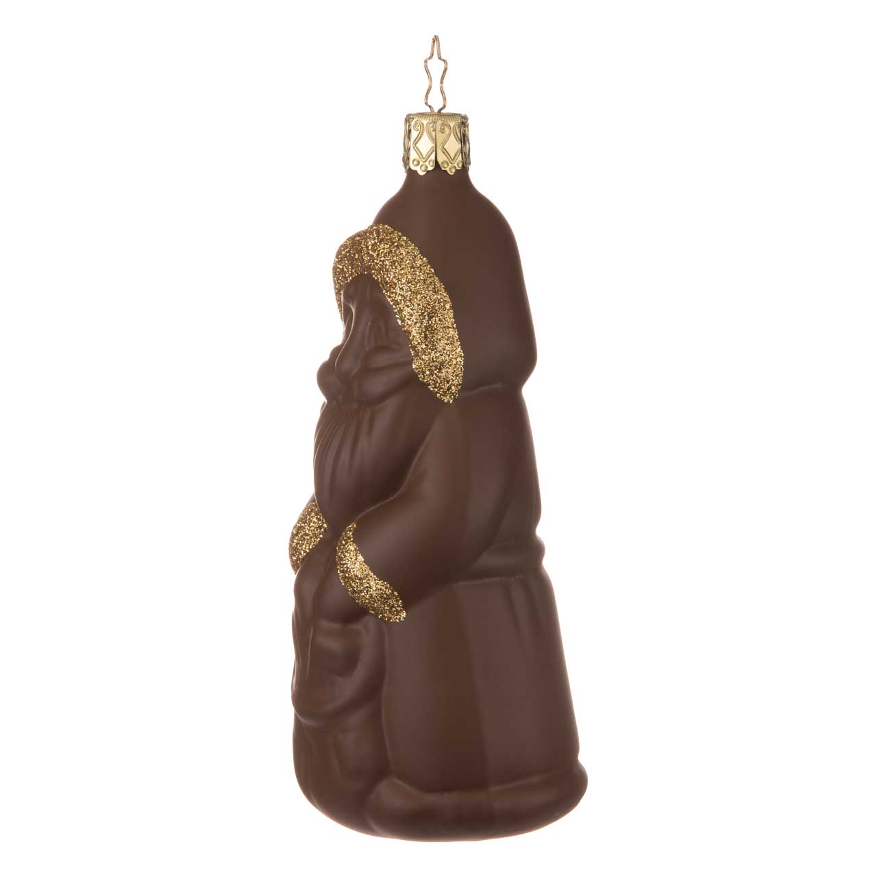 La figura mostra Babbo Natale in un look marrone cioccolato con dettagli dorati scintillanti sul cappuccio, sulle maniche e sul cappotto. La forma è classica e arrotondata e la colorazione ricorda ingannevolmente un corpo di cioccolato cavo. Un pezzo affascinante che fa venire subito voglia di Natale - e magari di un pezzetto di cioccolato.