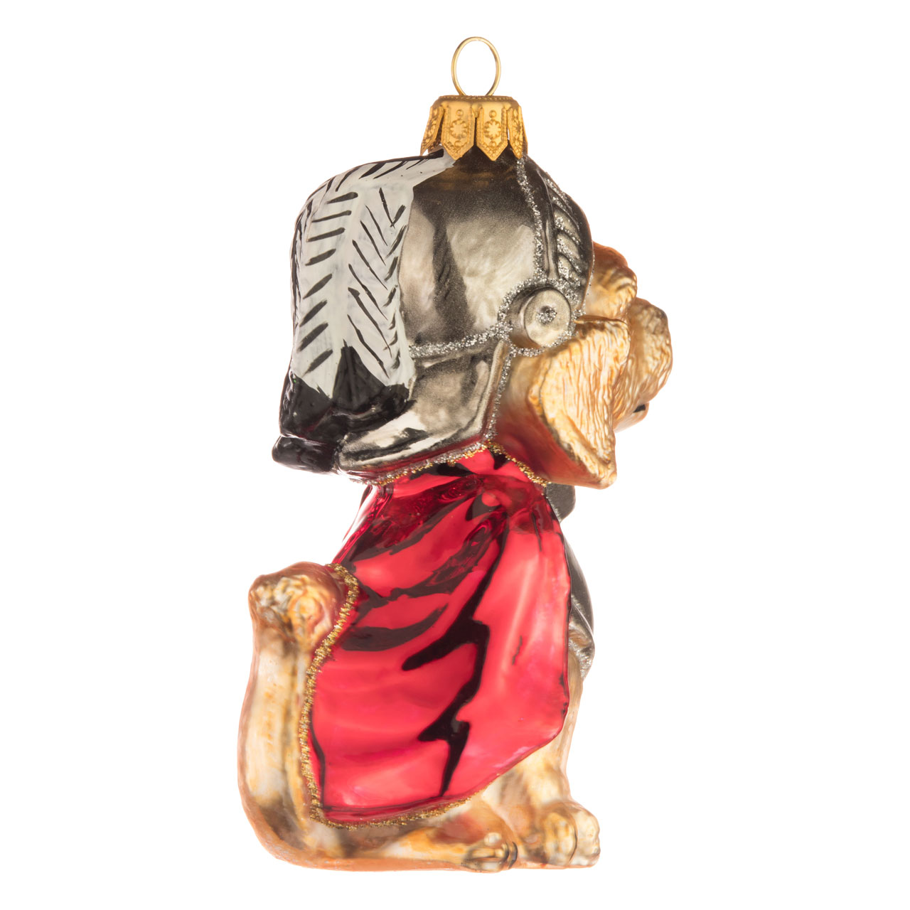 Proprio così, il migliore amico dell'uomo ha davvero tutto. È tante cose, con il suo manto chiaro, marrone argentato e leggermente irsuto, il muso nero lucido, gli occhi dipinti con amore e ricchi di dettagli, le zampette graziose e la coda gioiosamente eretta. Tuttavia, il vero punto forte è probabilmente la sua magnifica armatura da cavaliere, che lo trasforma in un cane da guardia unico. Con corazza metallica lucida, mantello rosso brillante e un elmo classico completo di visiera rovesciata e magnifico pennacchio screziato bianco e nero.