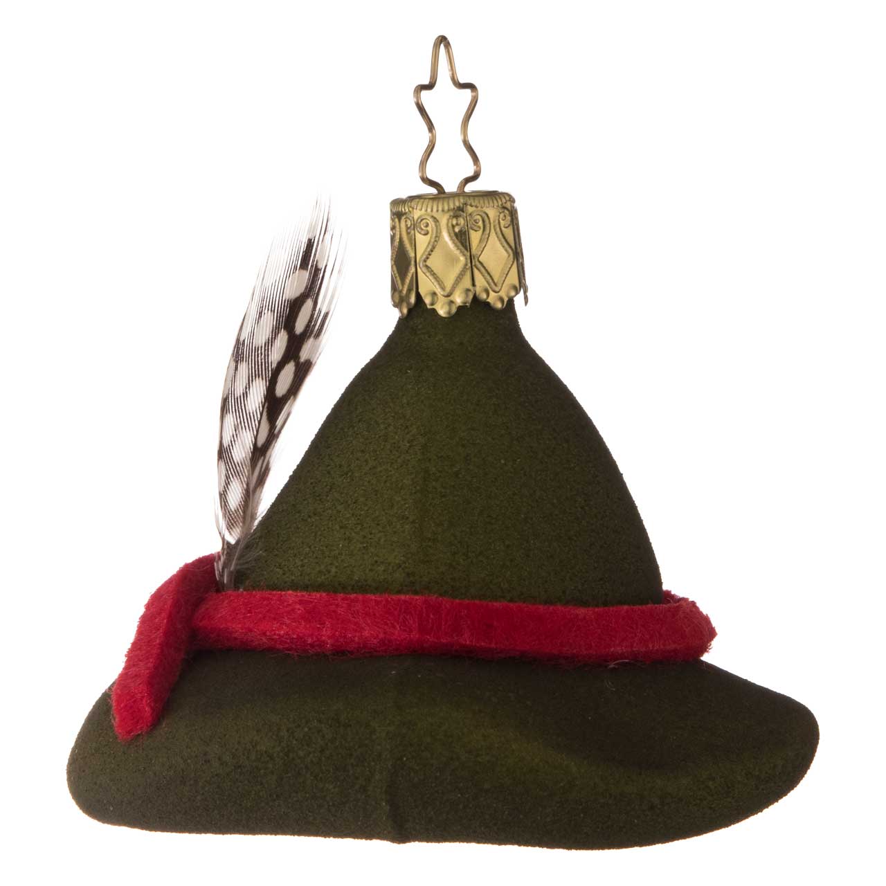 La figura si ispira a un classico cappello da guardia forestale, con tesa larga e corona leggermente bombata. È disponibile in un colore verde intenso e opaco, accentuato da un nastro rosso e da una piccola piuma dettagliata. Il pallone combina un aspetto morbido e tessile con un design chiaro, conferendogli un aspetto particolarmente autentico e affascinante.