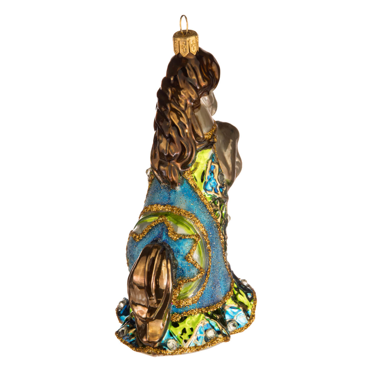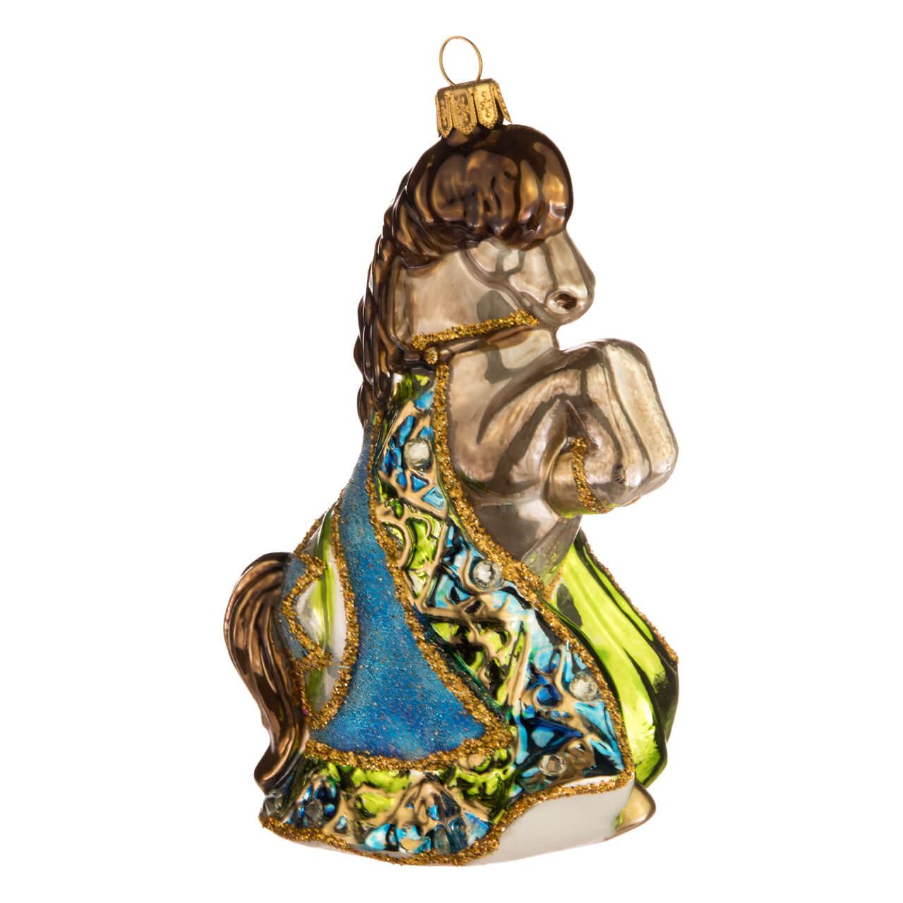 Tuttavia, ora potete godervi il vostro spettacolo animalista nel vostro salotto di Natale con questo buffo cavallo da circo. L'animale, di colore marrone argentato e lucido, si erge in modo mozzafiato (cioè sempre) sulle zampe posteriori, tenendo le zampe anteriori in aria. Una coperta riccamente decorata con motivi blu, verdi e dorati, che scintilla con molti glitter e strass argentati, oscilla festosamente intorno alla schiena dell'animale. Tuttavia, il punto forte è qualcosa di completamente diverso, ovvero la buffa criniera dell'animale. Marrone e strettamente arricciata, la tipica zazzera di capelli si gonfia sulla testa e sul collo dell'animale, coprendo l'occhio destro in modo che solo uno sia realmente visibile, creando un'espressione facciale davvero meravigliosa.