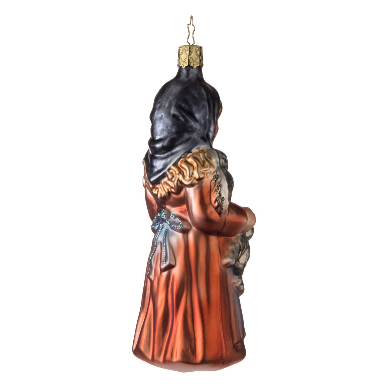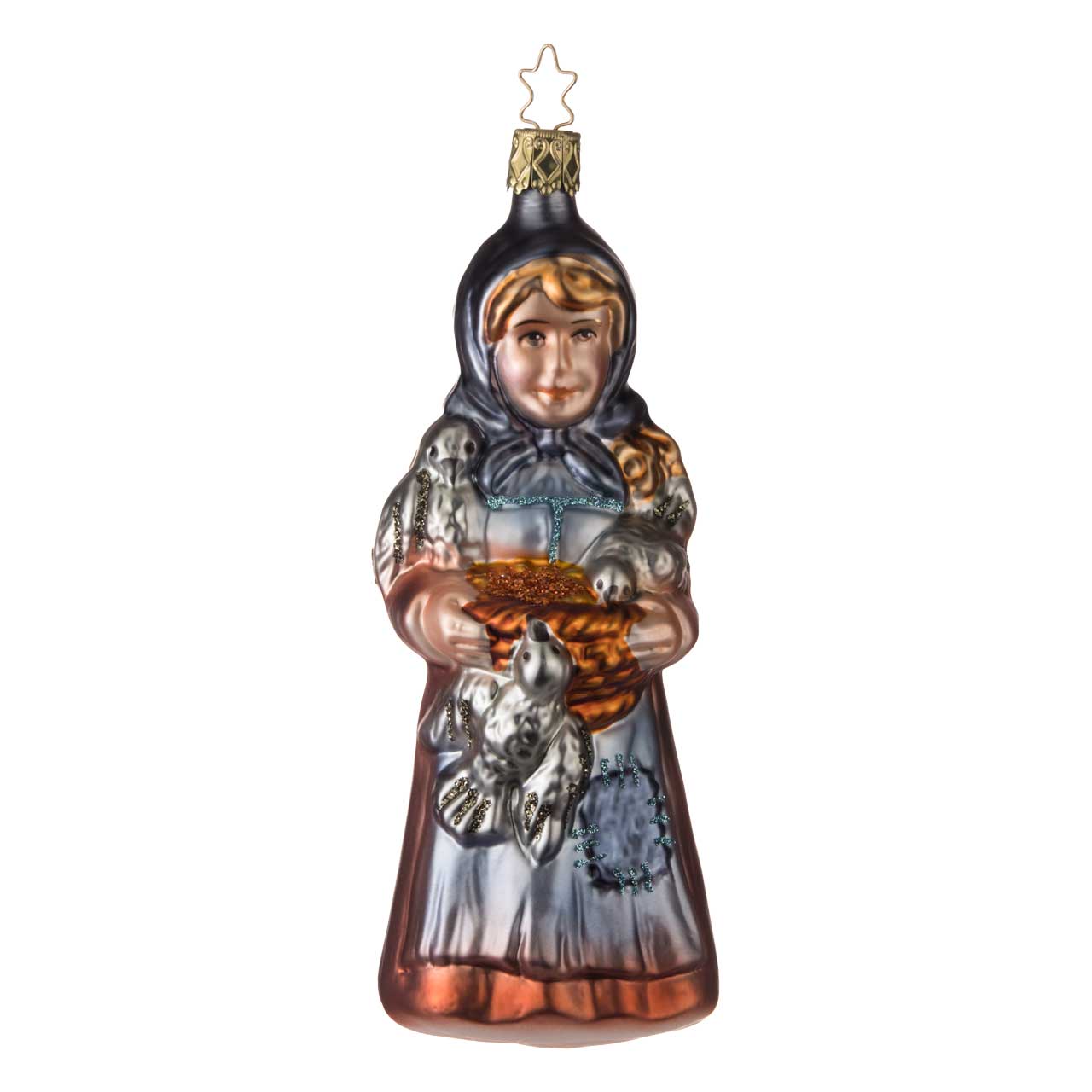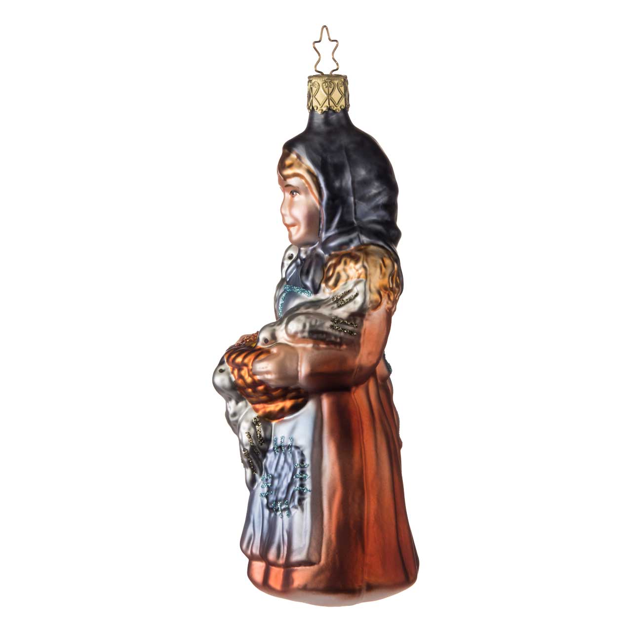 Questa raffigurazione mostra una figura amorevolmente disegnata sotto forma di ragazza con un foulard e un vestito scintillante nelle morbide tonalità del grigio, del blu e del rame. Tra le mani tiene una ciotola di grano color oro, circondata da uccelli d'argento lucenti: un motivo dettagliato pieno di magia fiabesca e di calore del cuore