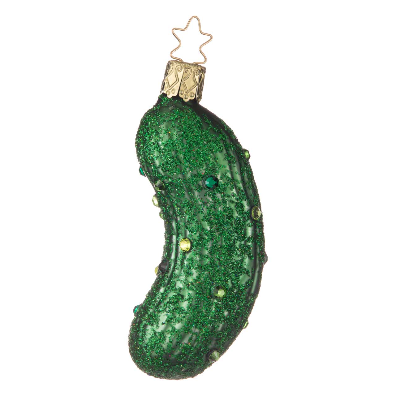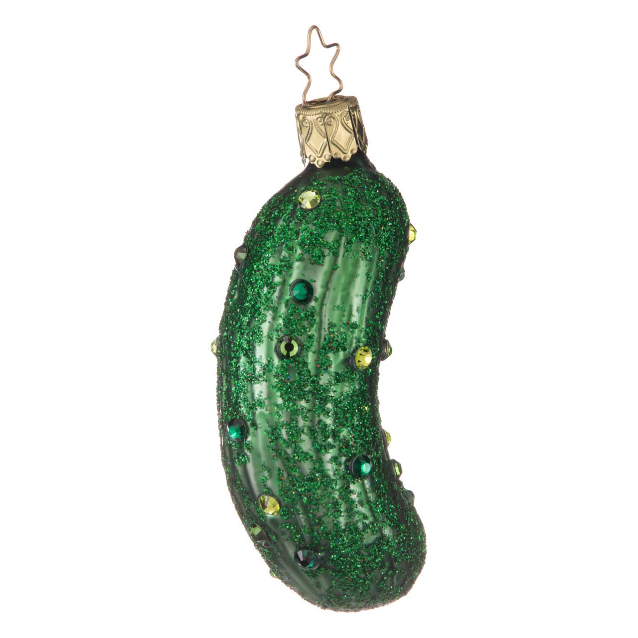 La statuetta ha la classica forma del cetriolo curvo ed è disponibile in un vivace colore verde. Accenti scintillanti e piccole gemme colorate decorano la superficie e conferiscono al motivo una lucentezza lussuosa e festosa.