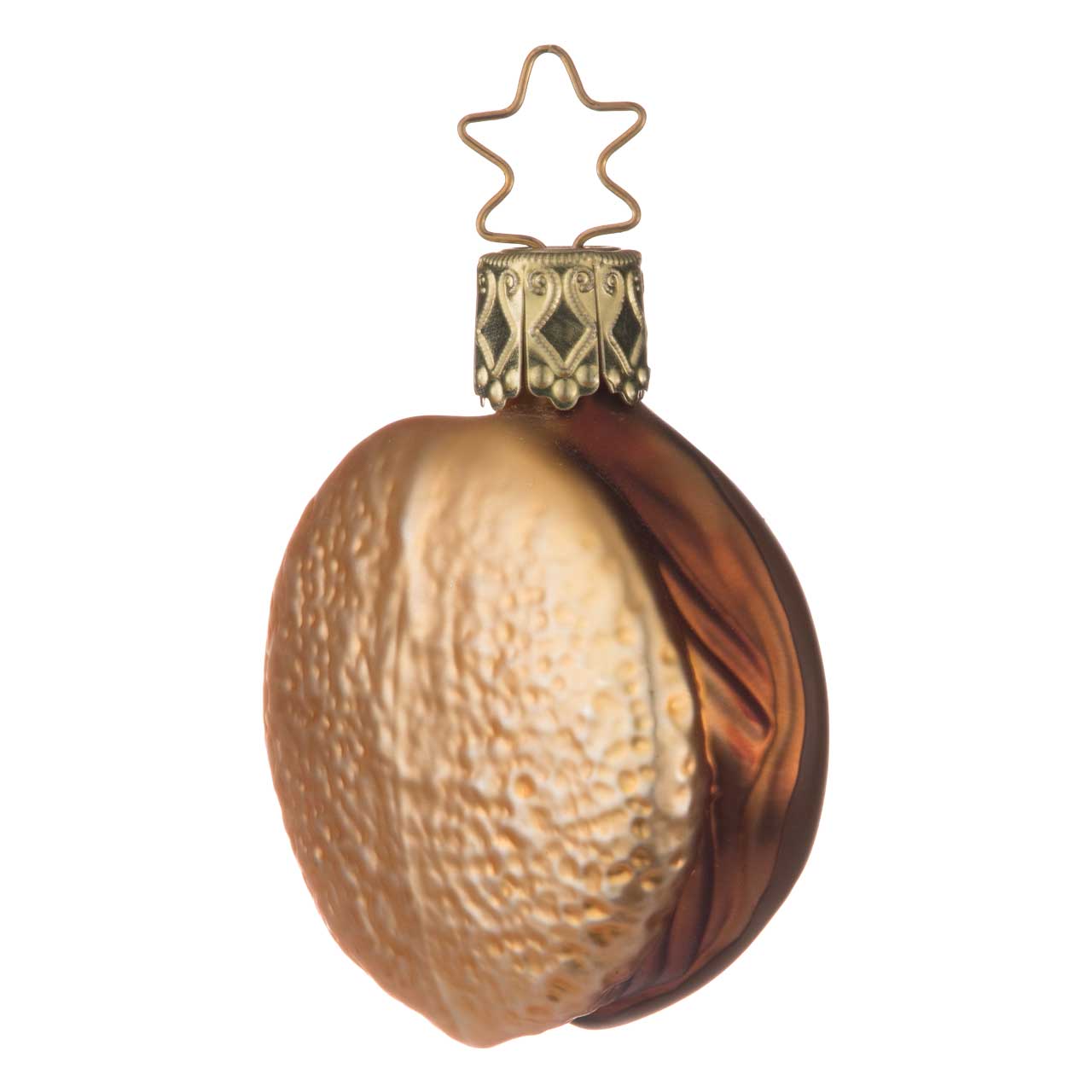 La pallina di Natale mostra un Ischler Krapferl rotondo con un design dettagliato: glassa di cioccolato marrone lucida con una mandorla chiara al centro, oltre alla consistenza dell'impasto marrone dorato sul lato. I colori marrone, beige e oro conferiscono alla pallina un carattere appetitoso e nostalgico.