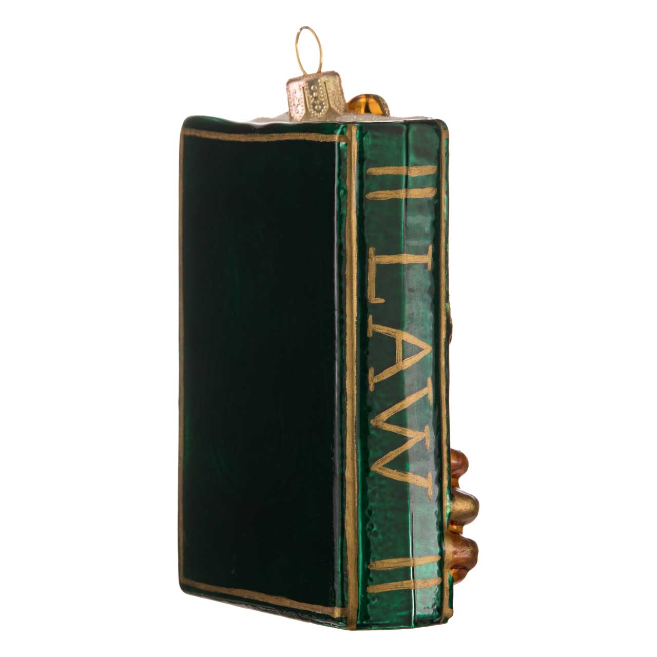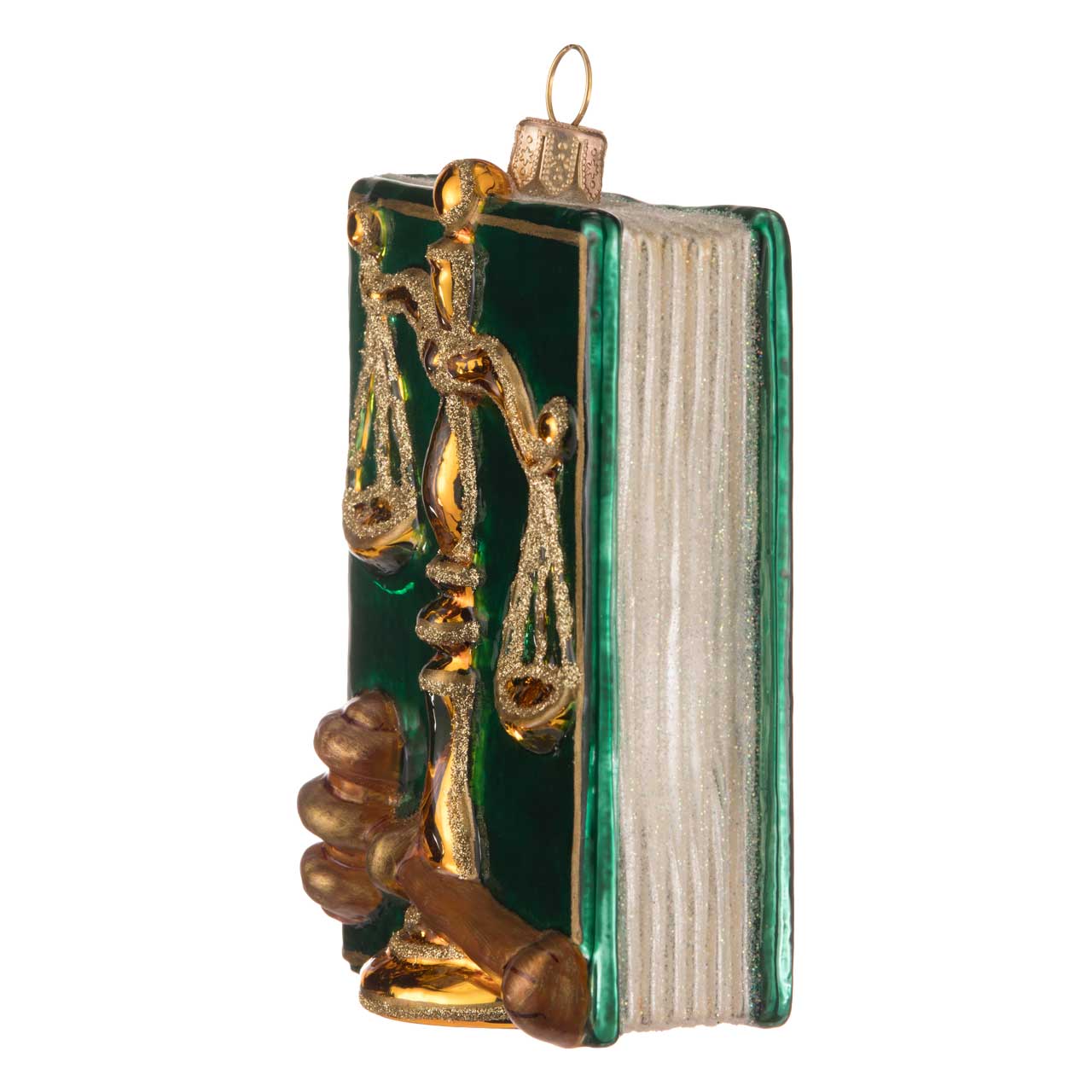 La parola "LAW" è incisa in lettere d'oro sul dorso del libro di legge verde scuro, decorato con linee dorate. La parte anteriore presenta un martello color legno e scale dorate con catene scintillanti che le sorreggono. Una delle bilance è leggermente sollevata, a sottolineare il processo di ricerca del giusto equilibrio piuttosto che suggerire uno squilibrio.