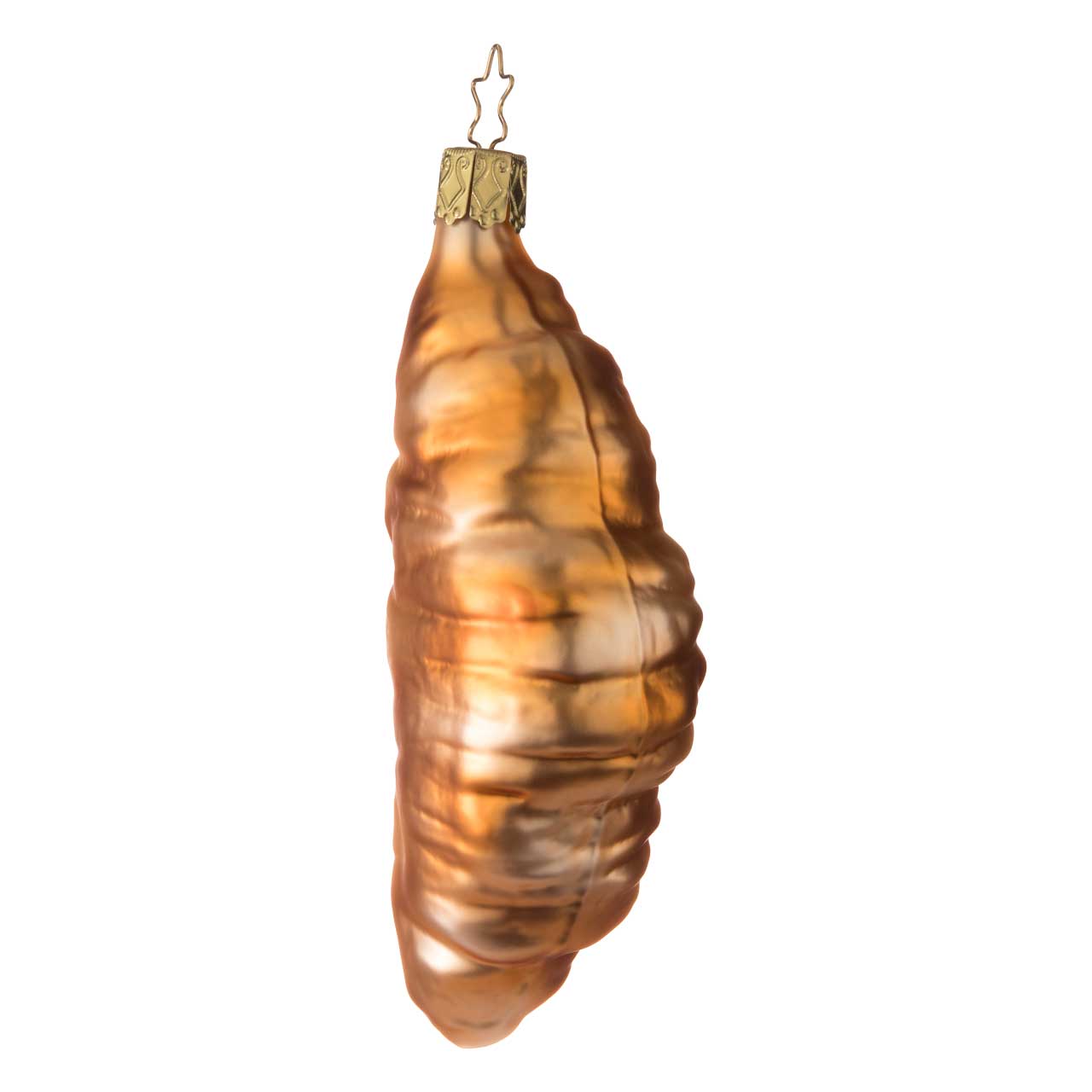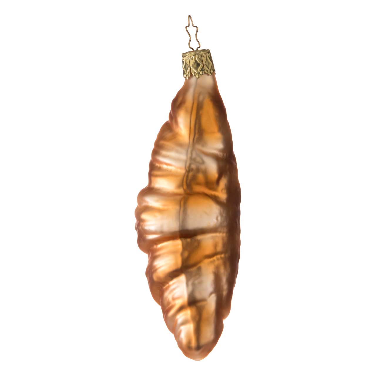 La statuetta ha la forma di un croissant allungato e attorcigliato e colpisce per la sua calda colorazione marrone dorata con sfumature scintillanti. La superficie ha un effetto leggermente strutturato e ricorda il tipico aspetto della pasta sfoglia, mentre la lucentezza crea un look sofisticato.