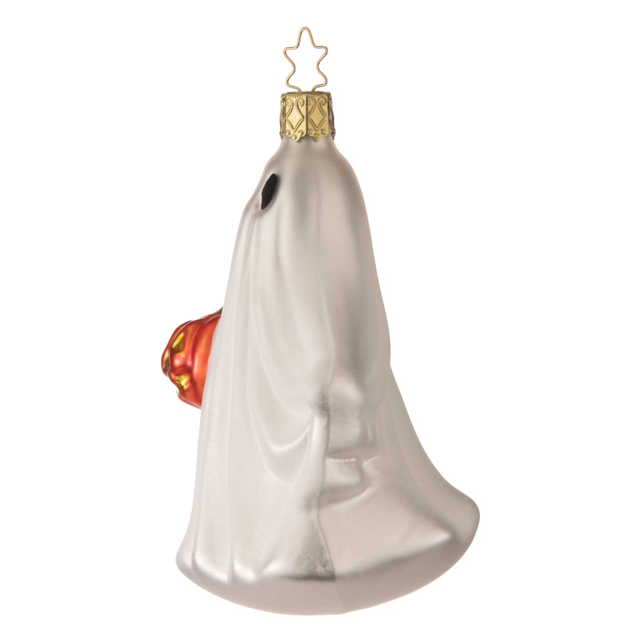 L'abbinamento con la zucca luminosa è particolarmente emozionante: un chiaro cenno alle tradizioni autunnali e un po' spettrali che possono essere meravigliosamente combinate con l'accoglienza invernale. Il risultato è un motivo che non solo ricorda Halloween, ma dimostra anche quanto possano essere giocose e versatili le decorazioni festive. Il fantasma sembra quasi presentare con orgoglio la sua piccola zucca, forse un reperto di una misteriosa escursione notturna