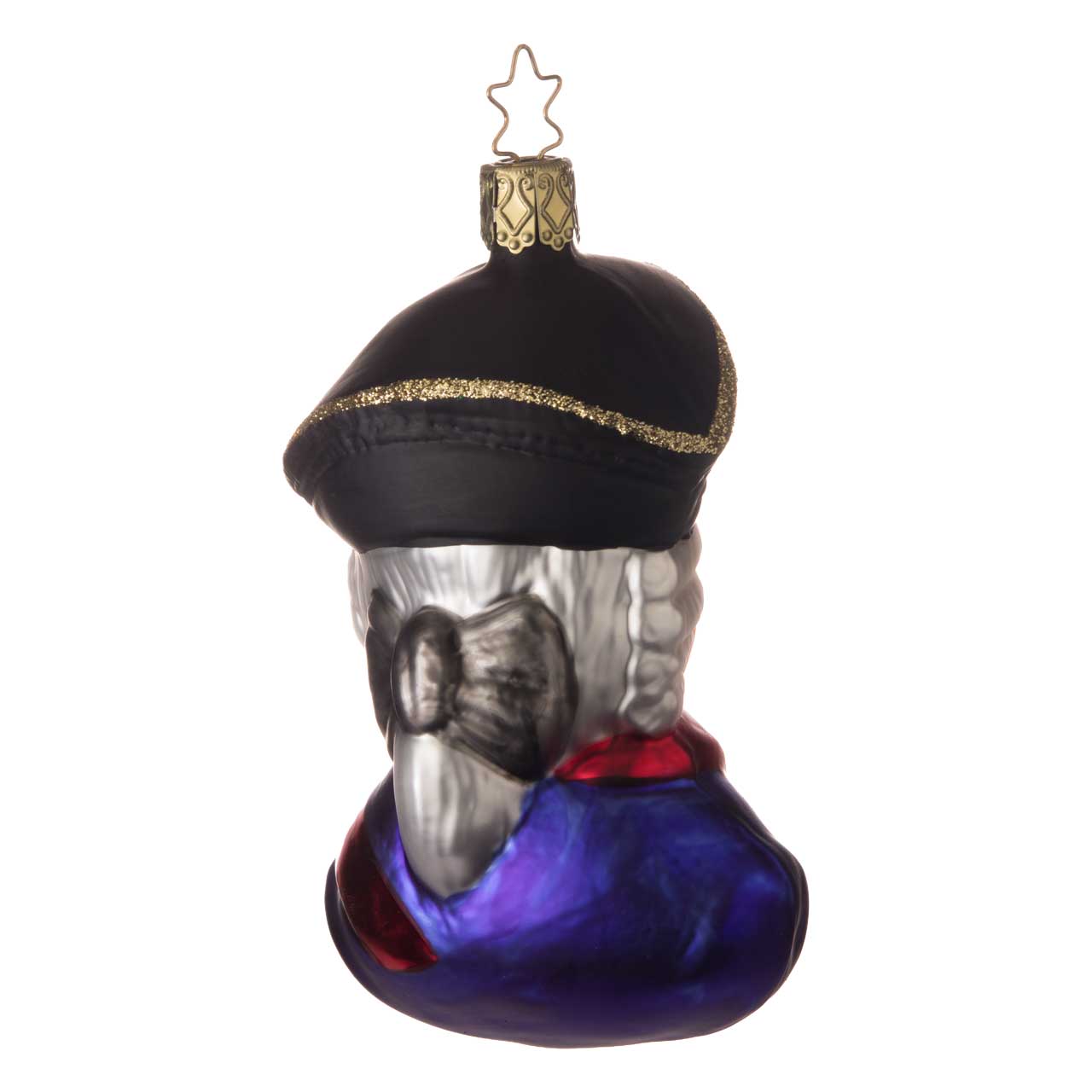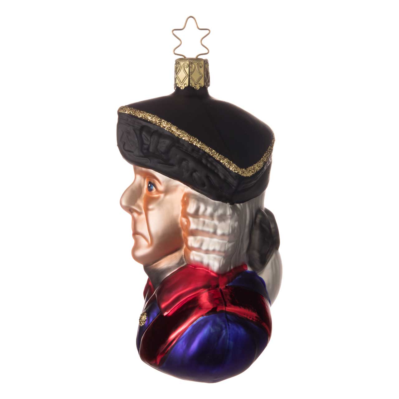 La pallina di Natale raffigura Federico il Grande come un busto dettagliato. Con i suoi tratti somatici realistici, una parrucca bianca e riccioluta, un cappello nero a tricorno con finiture dorate e un'uniforme blu e rossa con accenti dorati, è particolarmente impressionante.