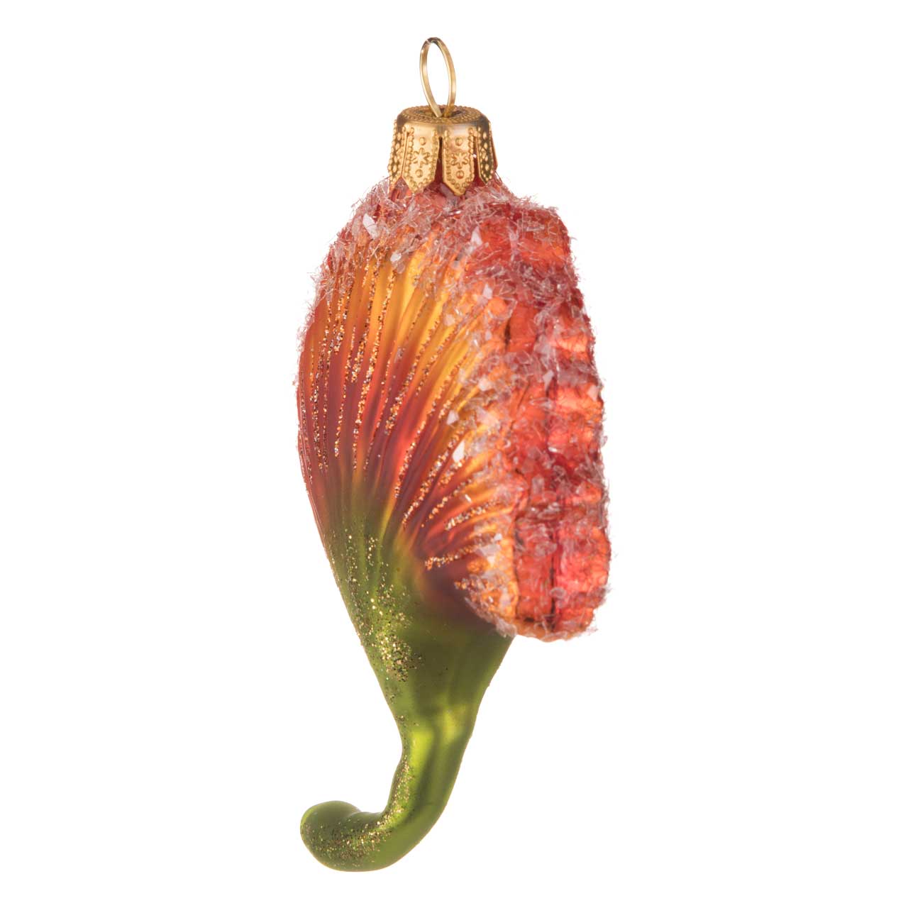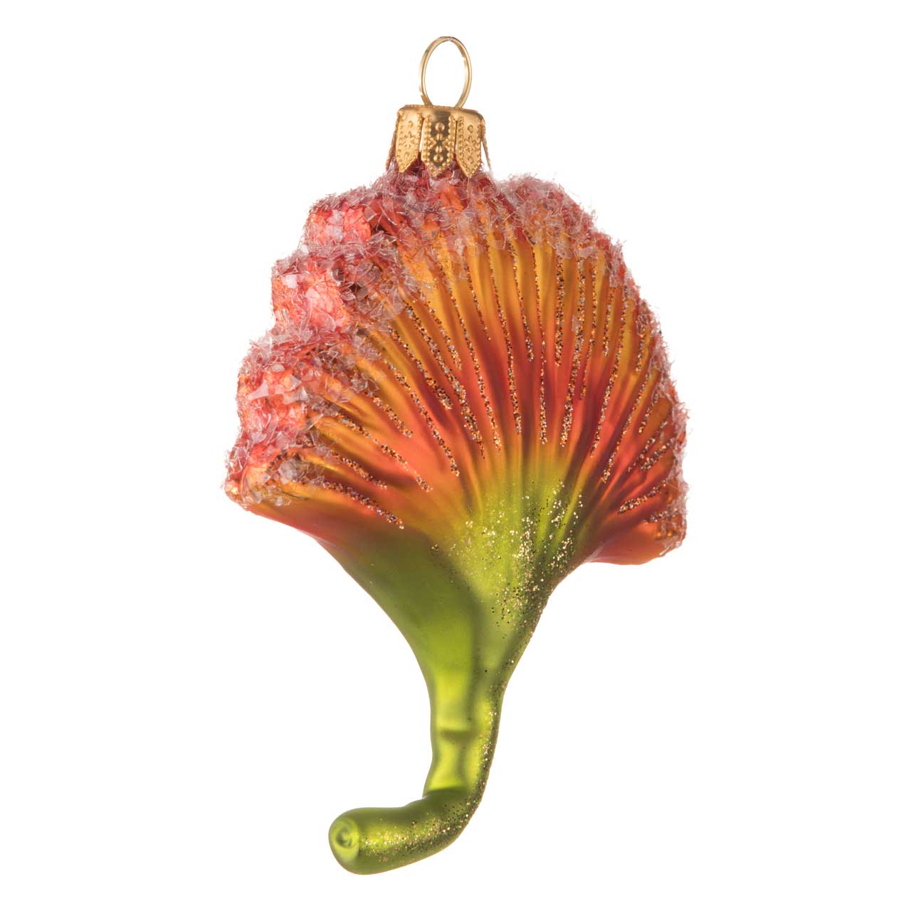 La foglia si distingue per la sua colorazione autunnale rosso-marrone, che sfuma in verde verso il gambo. La foglia è attraversata da sottili venature scintillanti e le punte sembrano essere ricoperte di brina. Lo stelo è curvo e riprende leggermente la forma semicircolare della foglia.