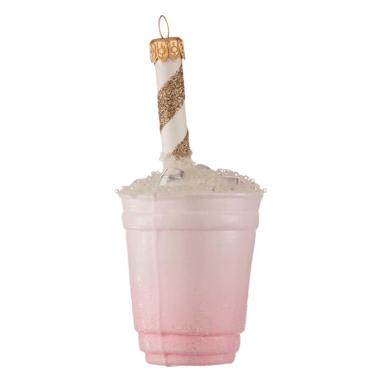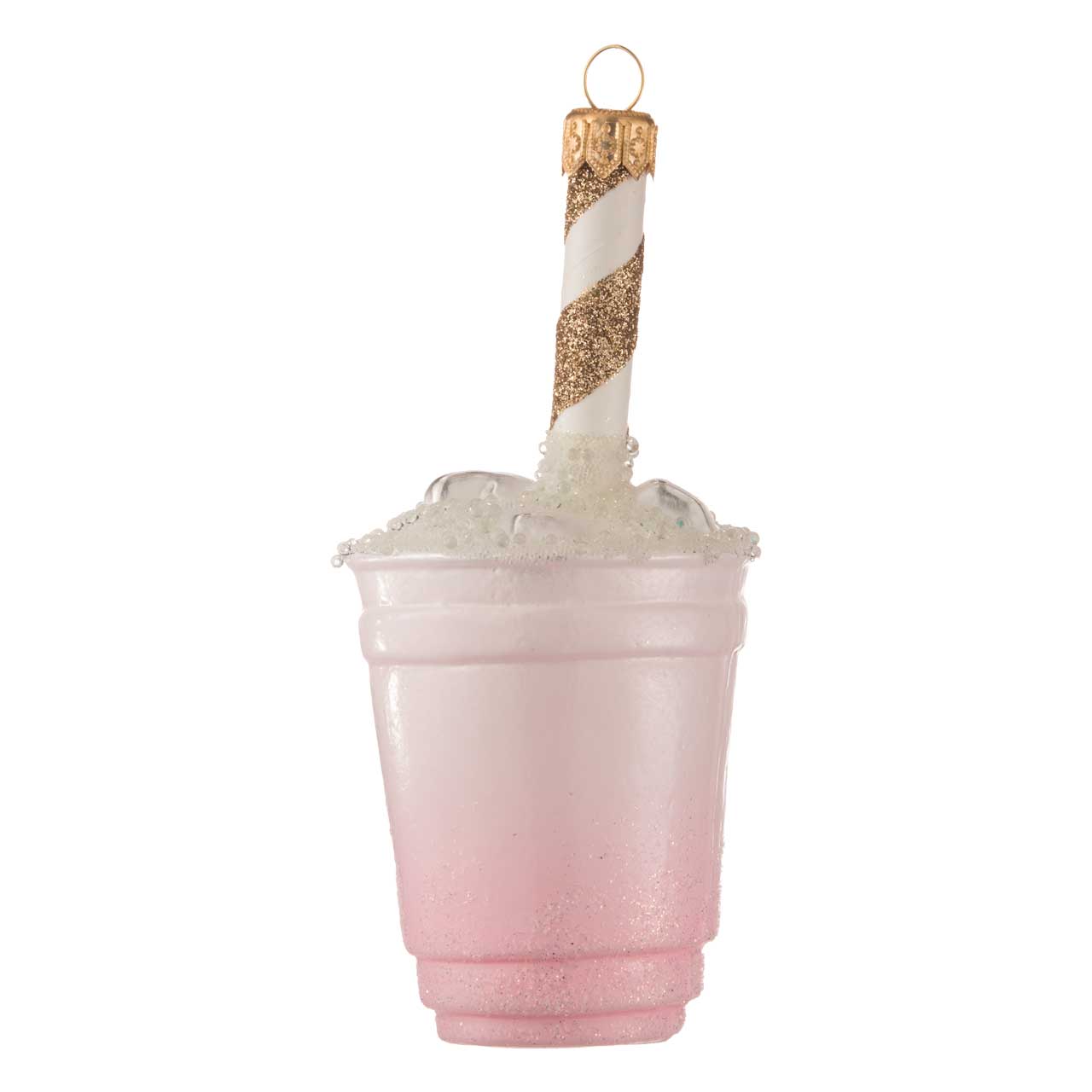 Il frullato si presenta in una semplice tazza. Il colore cambia leggermente da bianco a rosa, come un frullato alla fragola. Sulla superficie della bevanda, i cubetti di ghiaccio sembrano galleggiare in un mare di crema con cocco grattugiato. E la cannuccia a righe bianche e oro invoglia a bere. Il vetro e i brillantini possono essere così seducenti.