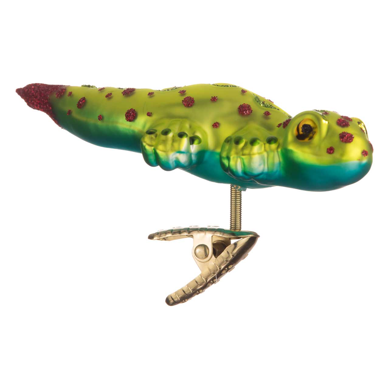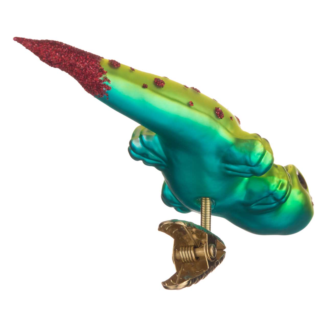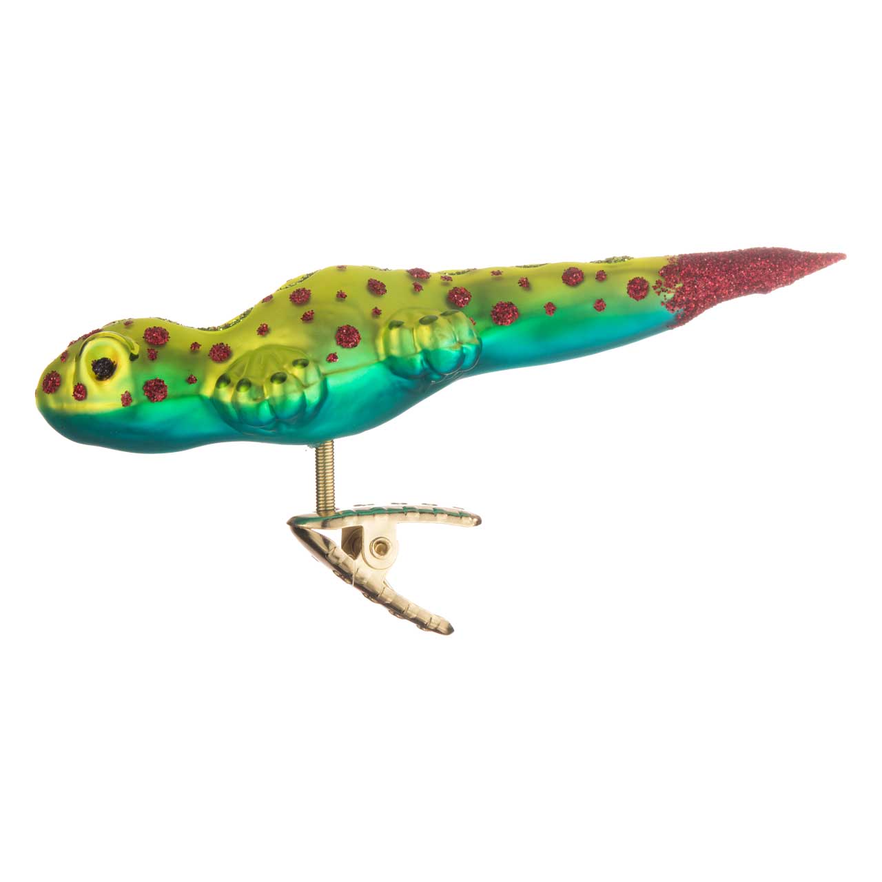 La statuetta raffigura un geco di forma allungata con il corpo verde brillante, il ventre turchese e i vistosi puntini rossi. La forma è piatta e allungata, con zampe finemente lavorate e una testa dall'aspetto vigile. La colorazione lucida e i dettagli glitterati conferiscono all'animale un aspetto vivace.
