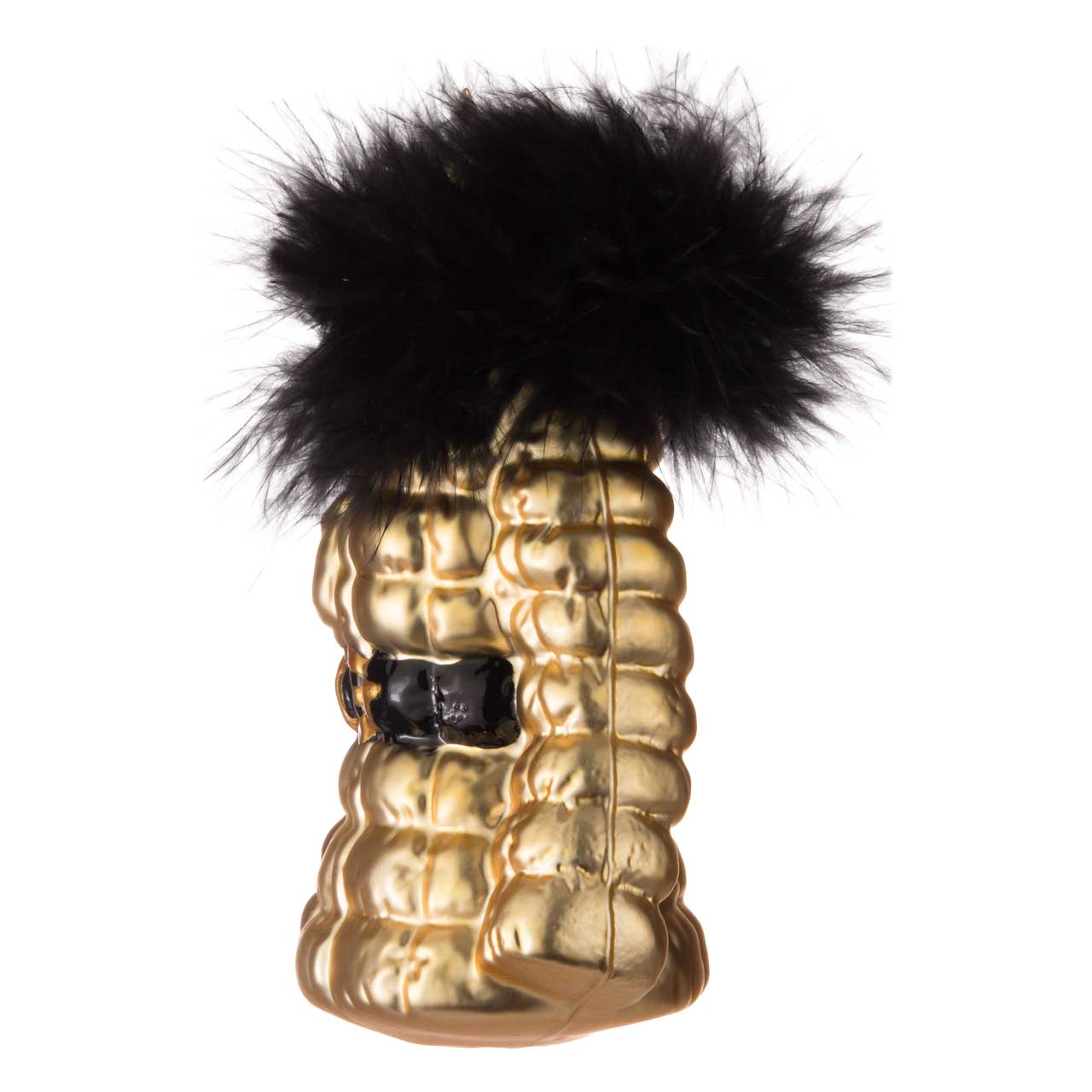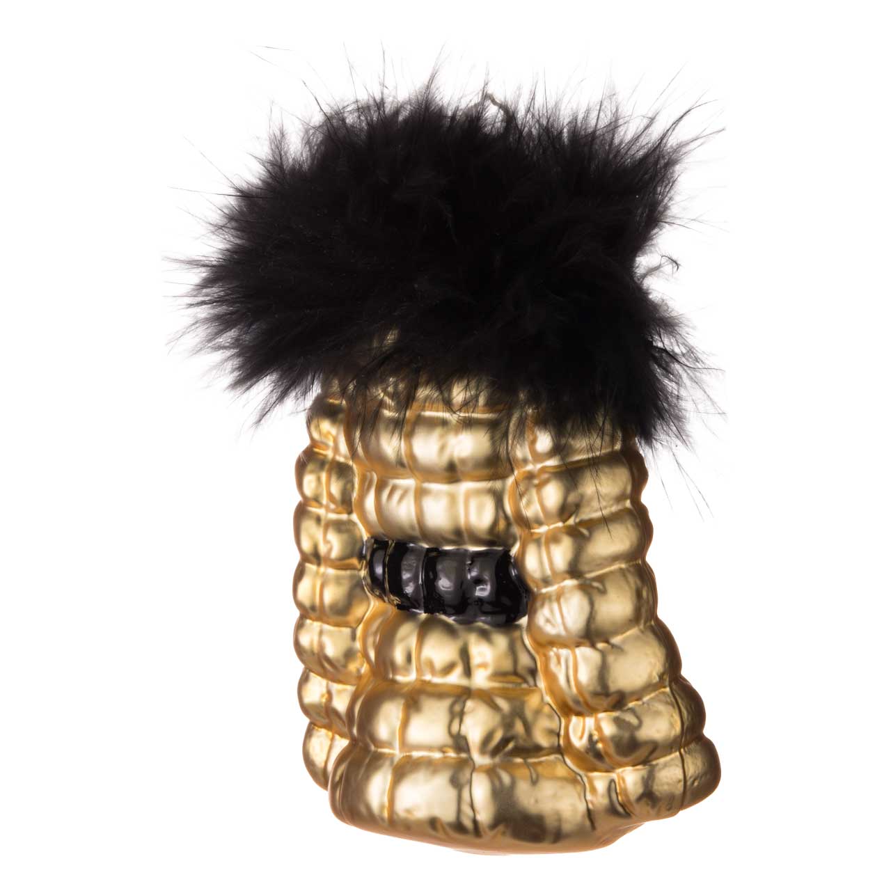 La figura mostra una dettagliata giacca trapuntata in oro lucido con cintura nera e un vistoso colletto in pile nero. La superficie strutturata enfatizza la lucentezza metallica, mentre le morbide piume creano un emozionante contrasto. Uno straordinario pezzo di design in oro e nero dal lussuoso fascino invernale.