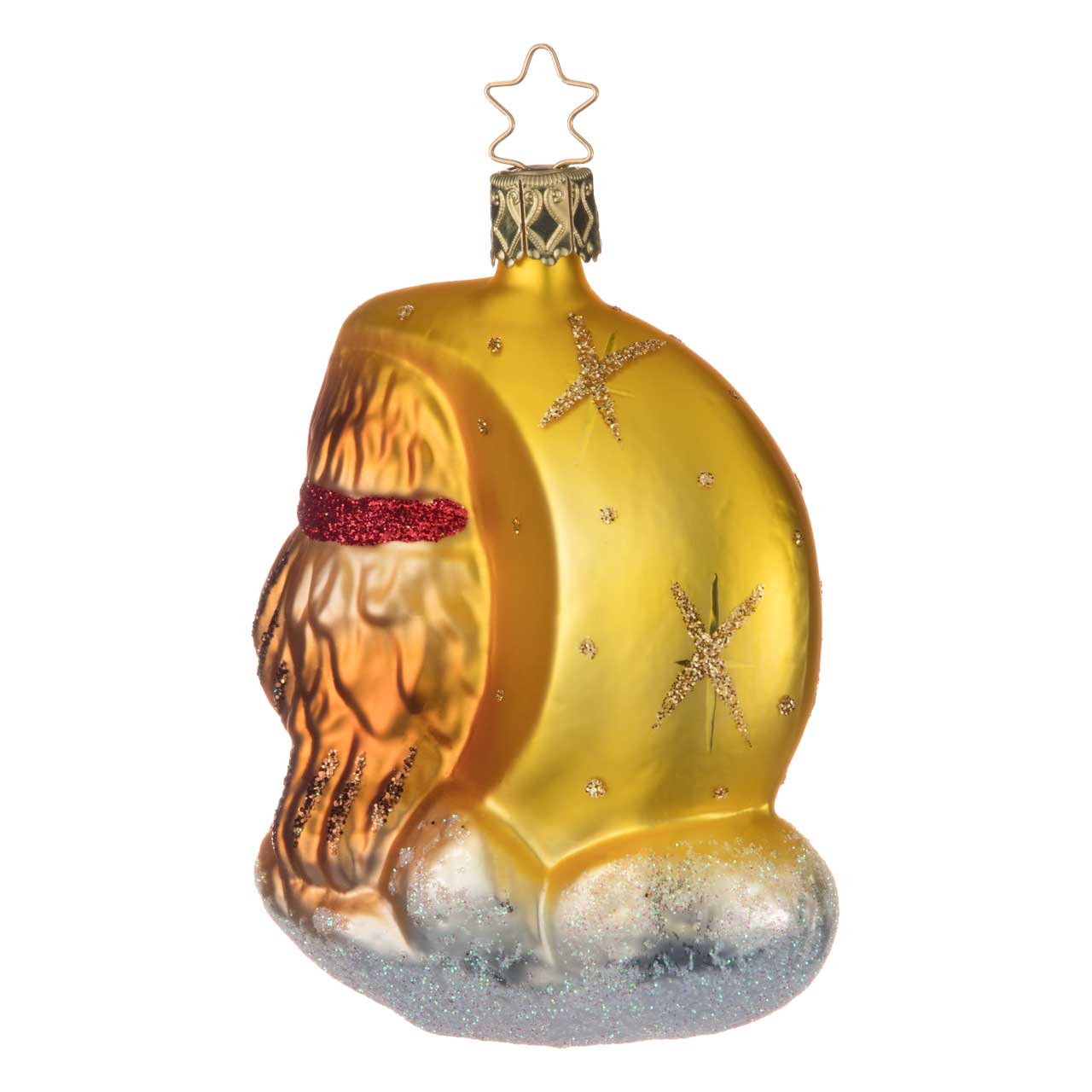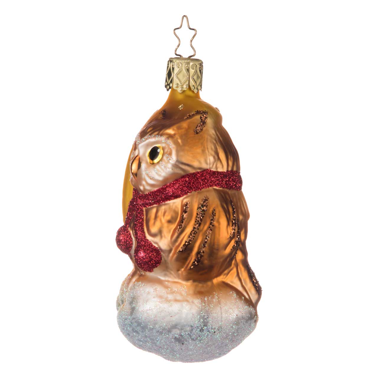 Questa statuetta raffigura un gufo marrone dorato con grandi occhi attenti, seduto su un terreno coperto di neve. Intorno al collo ha una sciarpa rossa scintillante. Sullo sfondo si staglia una luna gialla e dorata, decorata con stelle scintillanti. La combinazione dei toni caldi del marrone e dell'oro con la neve argentata e gli accenti rossi rende il motivo un richiamo visivo particolarmente suggestivo.