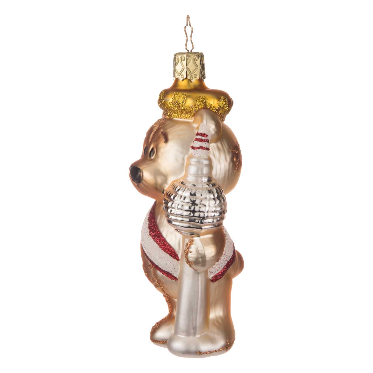 Figura a forma di orso d'oro scintillante con corona, fascia rossa e la torre della televisione d'argento nella zampa. I dettagli lucenti in oro, rosso e argento conferiscono al motivo un aspetto festoso con un chiaro riferimento a Berlino.