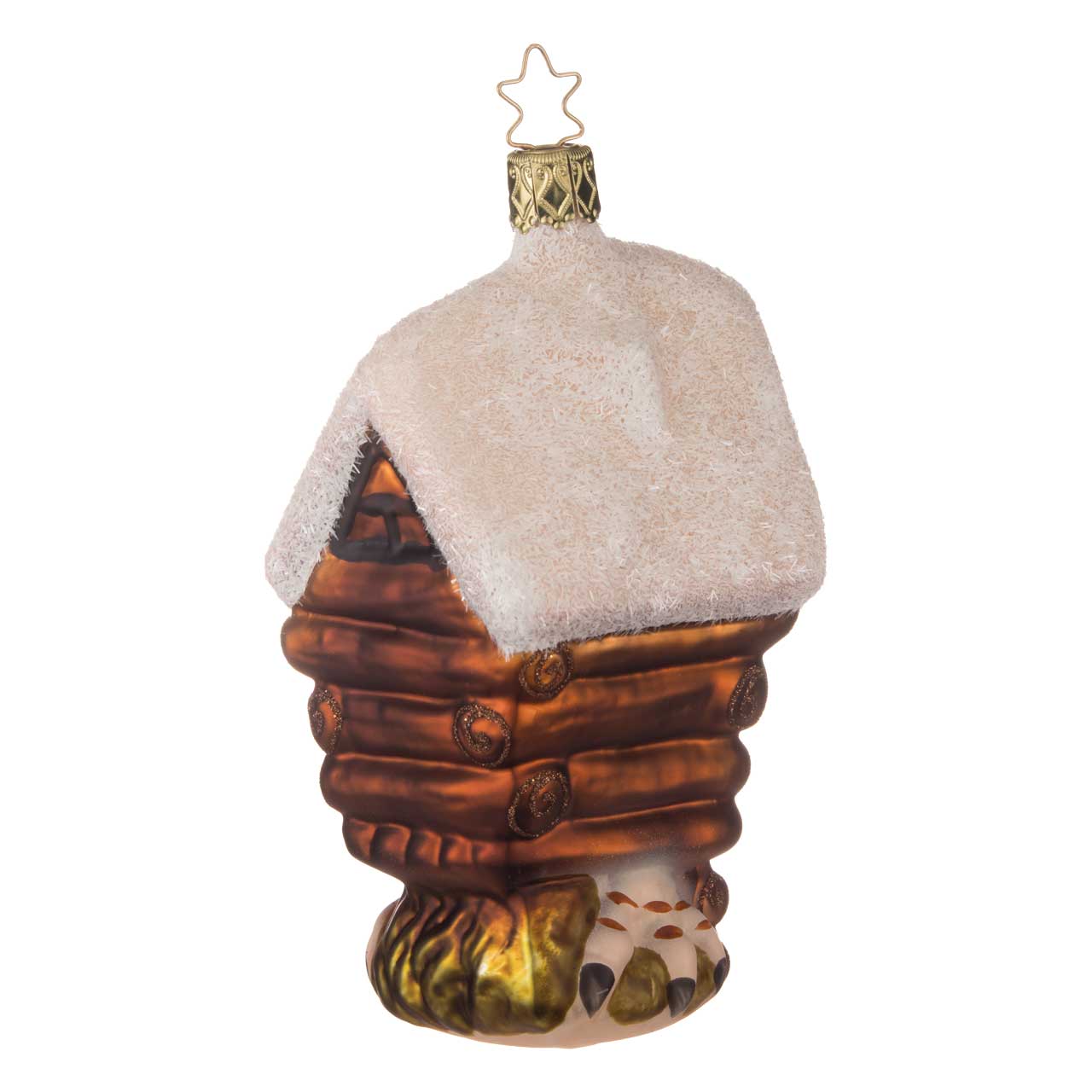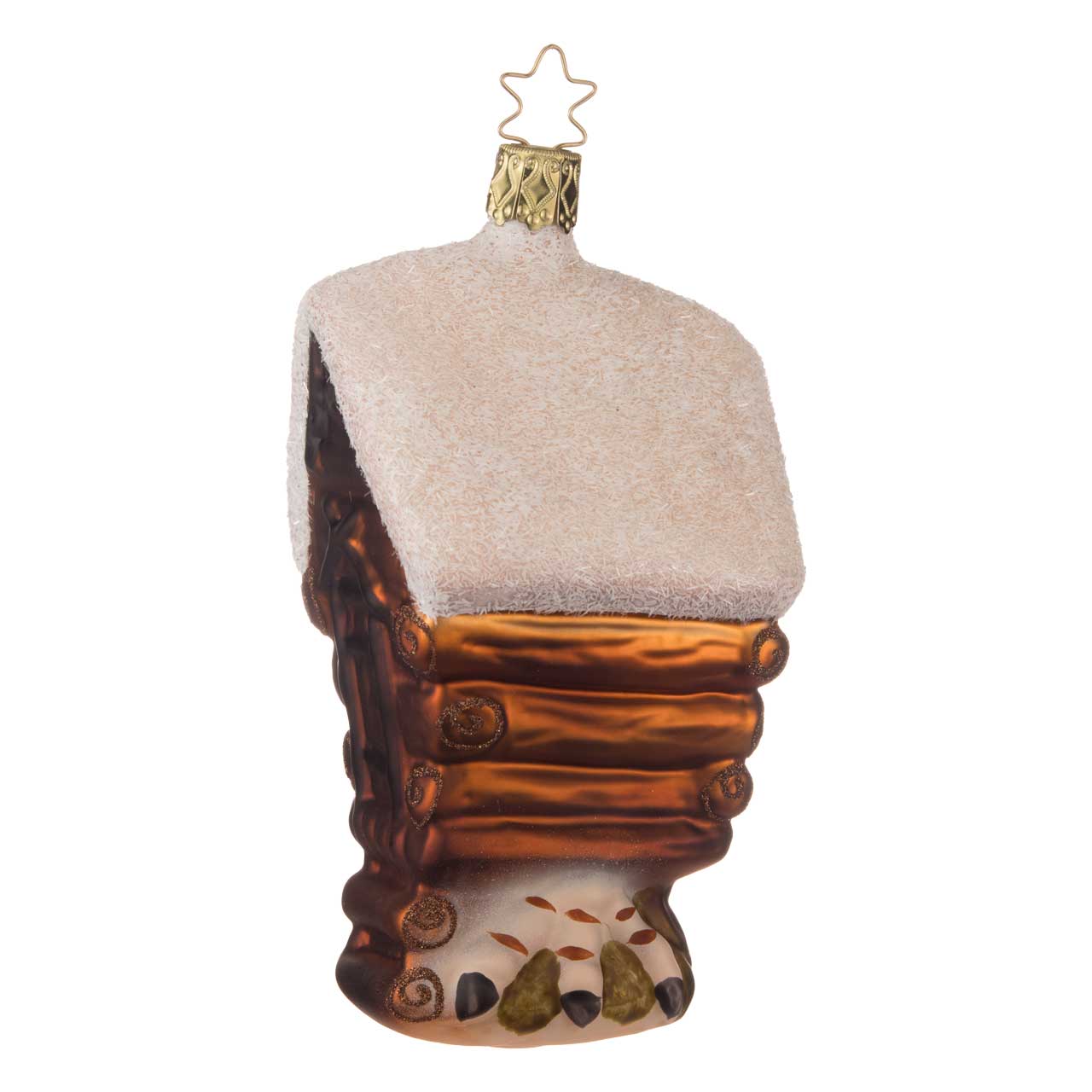 La figura raffigura una rustica capanna di legno con un caratteristico tetto coperto di neve. Le pareti sono disegnate nelle calde tonalità del marrone del legno, mentre sottili accenti in nero e beige sottolineano la struttura dei tronchi e l'ingresso. Il tetto bianco e scintillante crea un contrasto luminoso e conferisce alla capanna un carattere invernale.