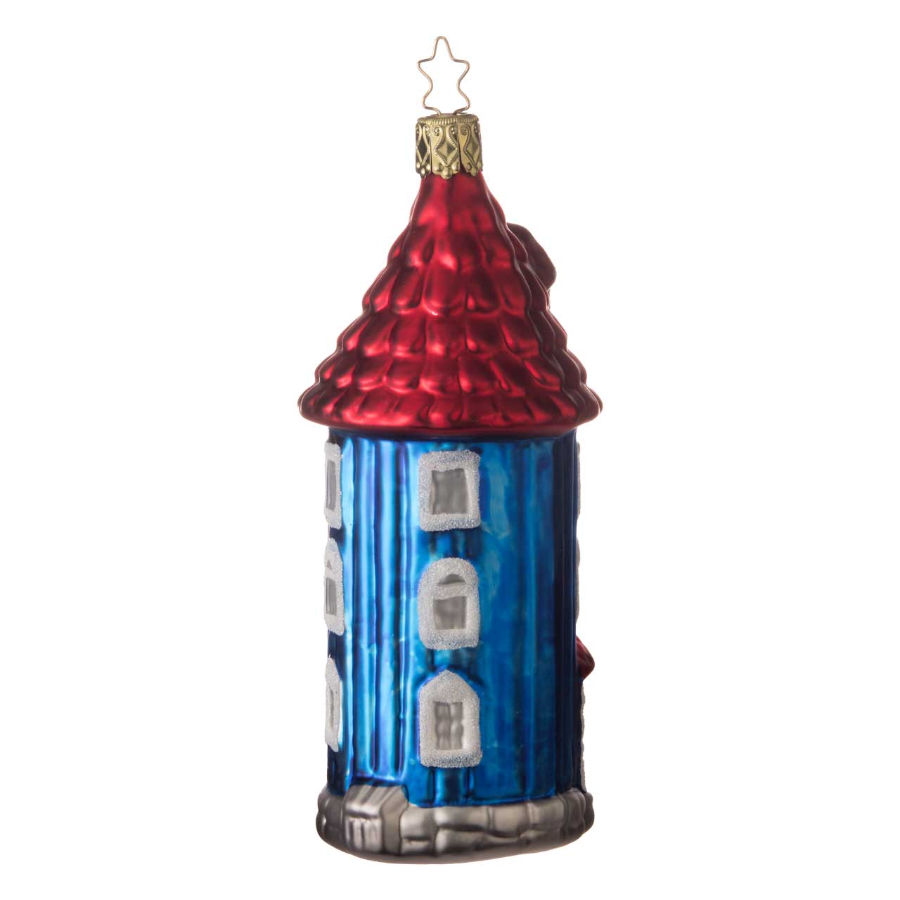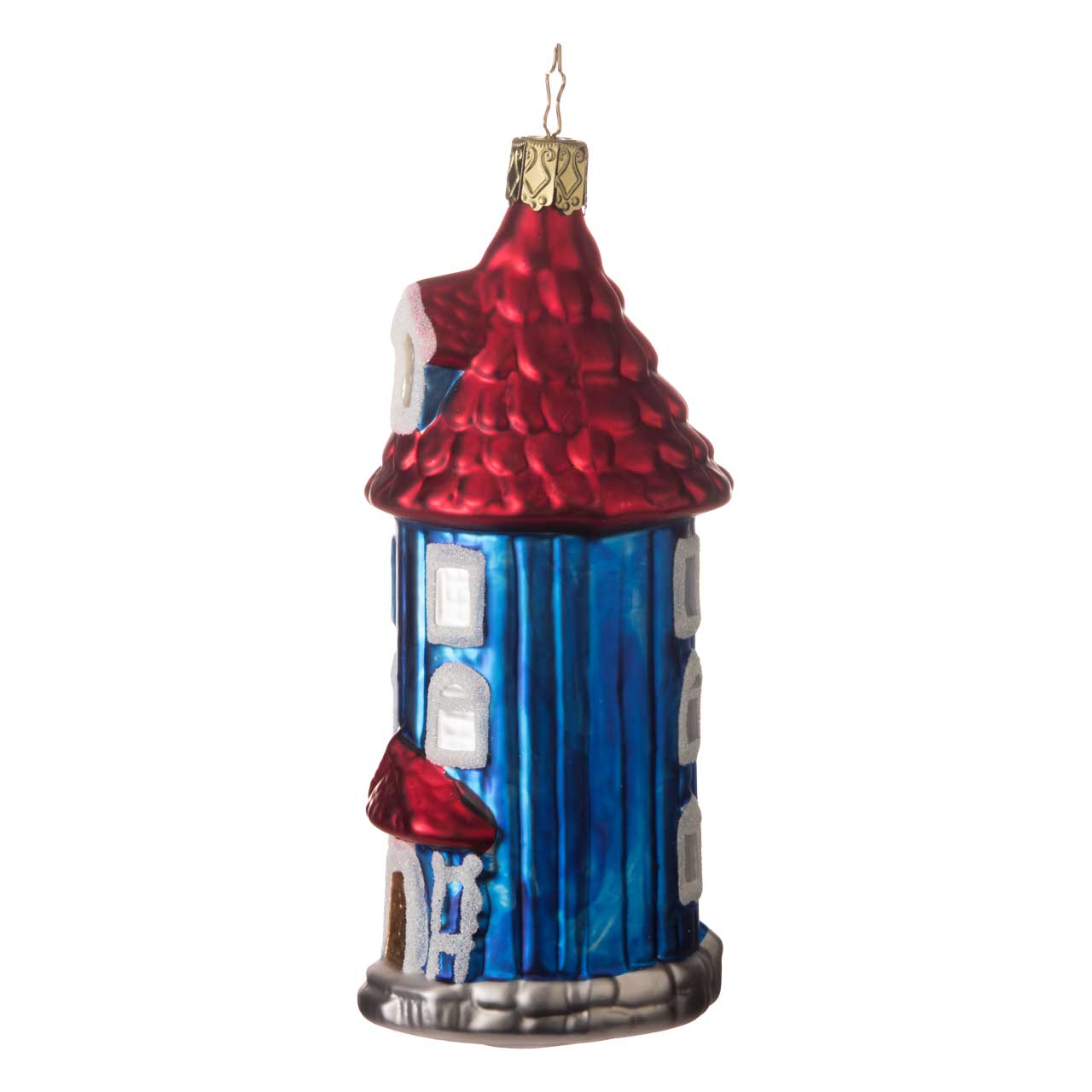 La statuetta raffigura la famosa casa in una forma allungata, simile a una torre. È disegnata in blu brillante, con molte finestre bianche enfatizzate da brillantini d'argento. Il tetto risplende di un rosso intenso, mentre la base e la porta sono in grigio e oro. Un disegno dettagliato e colorato che cattura immediatamente l'attenzione.