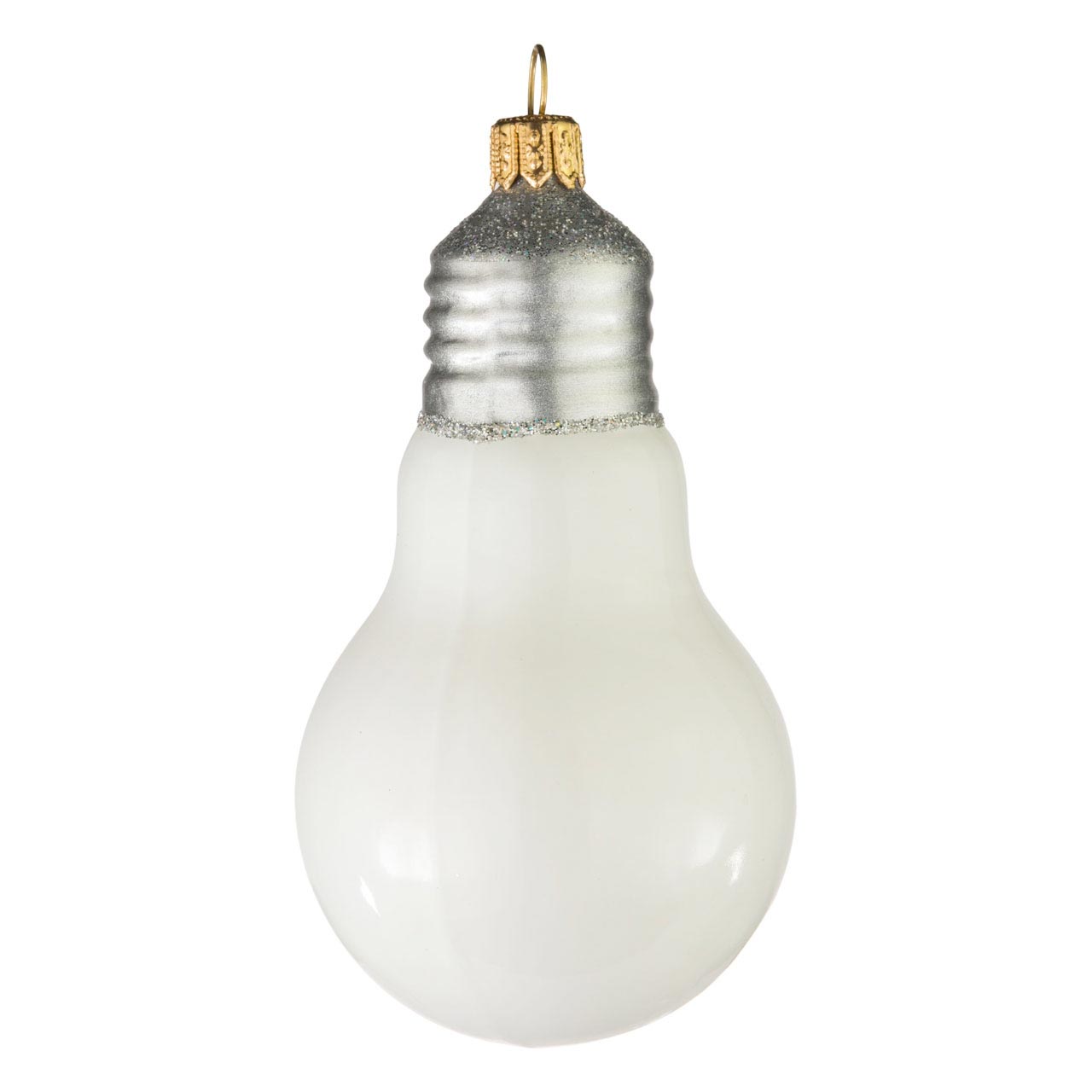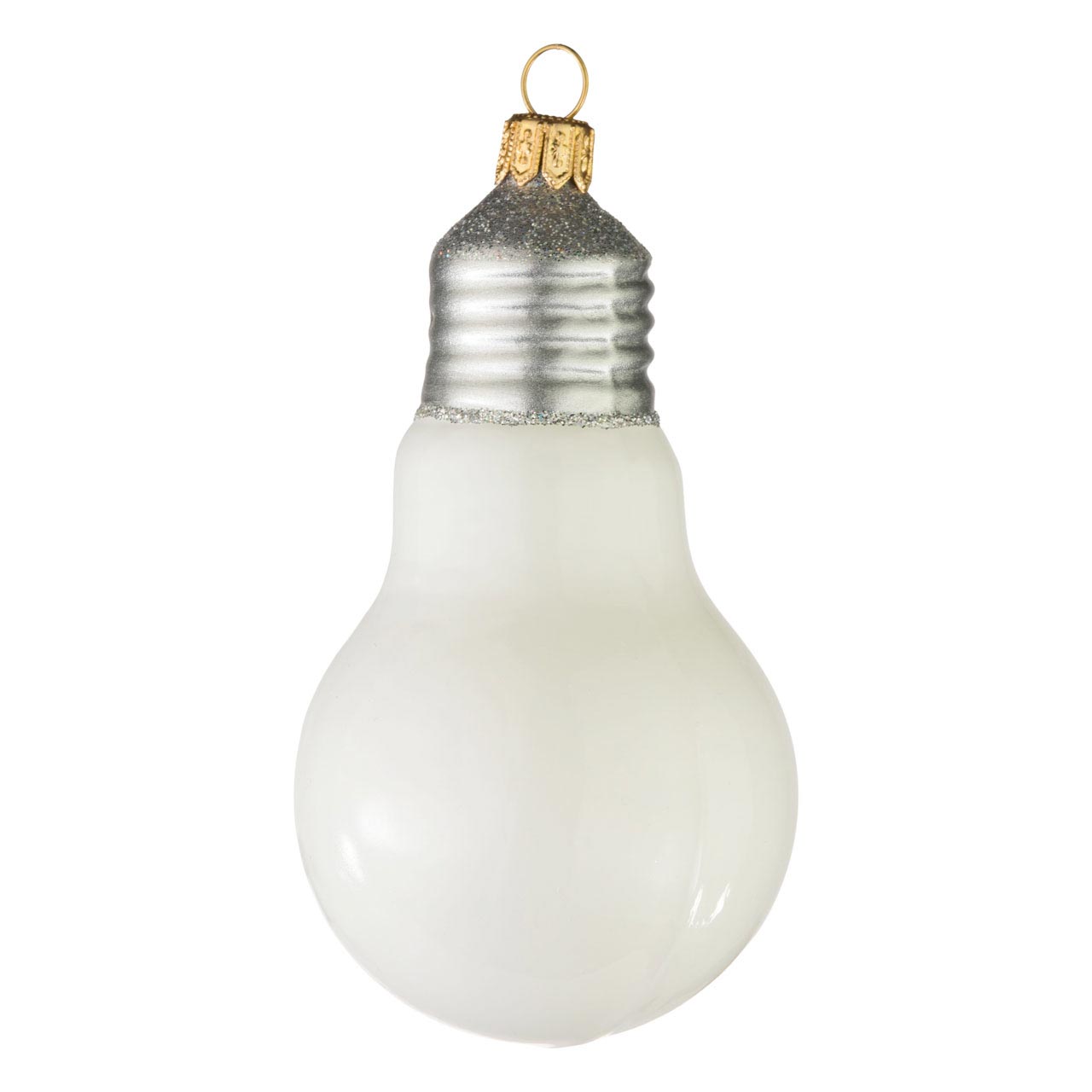 La lampadina per l'albero di Natale sembra una lampadina per la lampada della cucina, per le luci delle fate in giardino o per la lampada da terra alla finestra: un classico. Il bulbo di vetro a forma di pera è colorato di bianco latte con una lucentezza opaca. La base con il tipico filo brilla di argento metallizzato. La polvere di glitter argento sulla base e sul bordo superiore della base conferisce alla figura, altrimenti piuttosto sobria, quel qualcosa in più.
