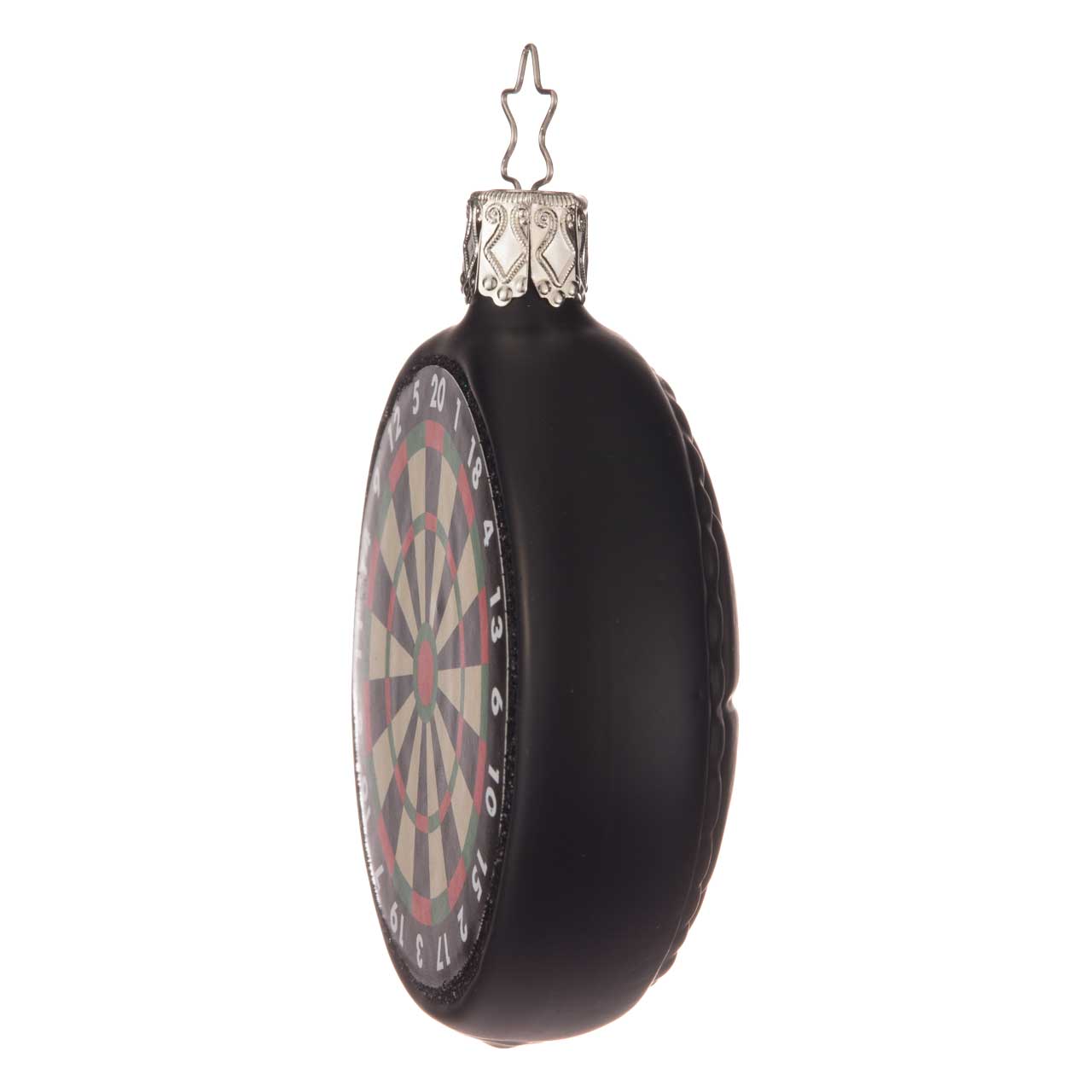 Il nostro bersaglio per freccette è solo a scopo decorativo ed è leggermente più piccolo, ma per il resto rispetta tutte le regole: i numeri, il doppio, il triplo e l'occhio di bue. Per il resto, il disco è mantenuto in un semplice colore nero. Il retro è decorato con linee leggere che ricordano la classica rete metallica.