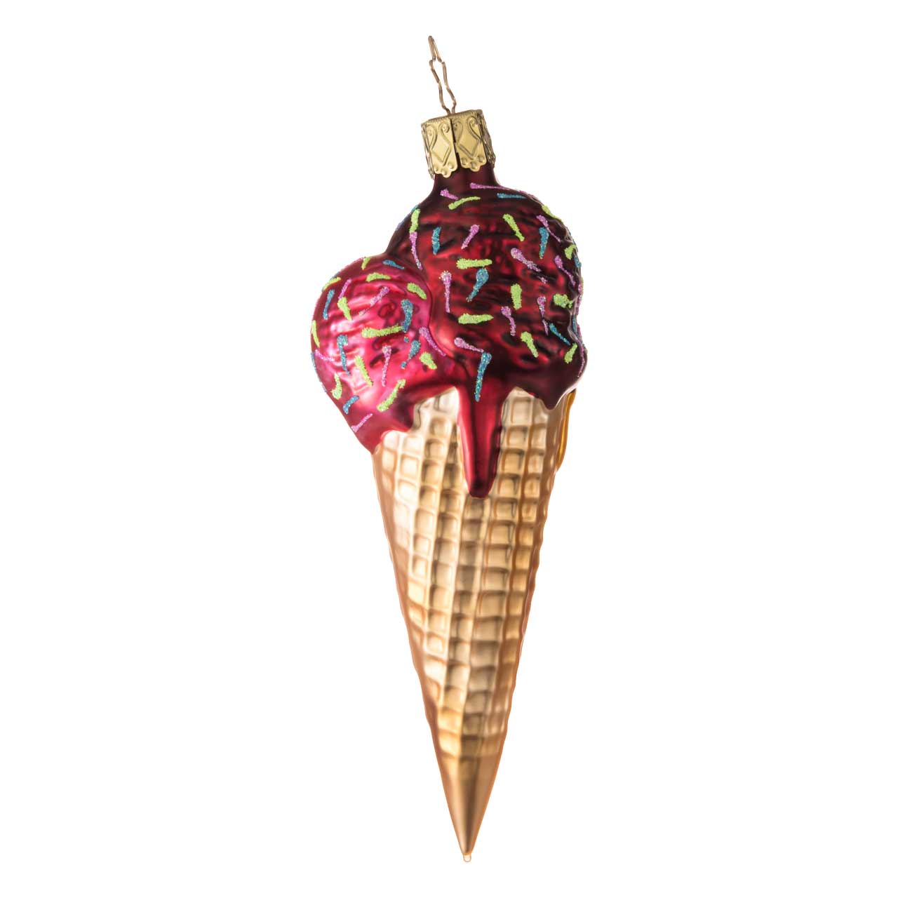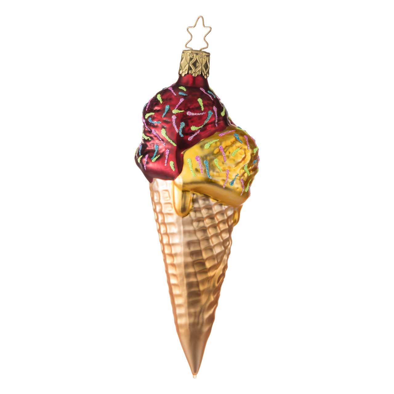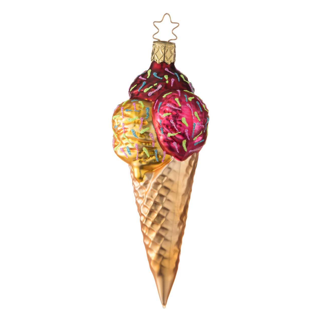 La figura mostra una cialda allungata con due golose palline di gelato nei colori rosso brillante e giallo tenue, decorate con zuccherini colorati. La cialda stessa è nei toni caldi dell'oro e del beige e presenta una texture dettagliata che le conferisce un aspetto particolarmente vivace. La superficie lucida sottolinea il carattere dolce e decorativo della statuetta.