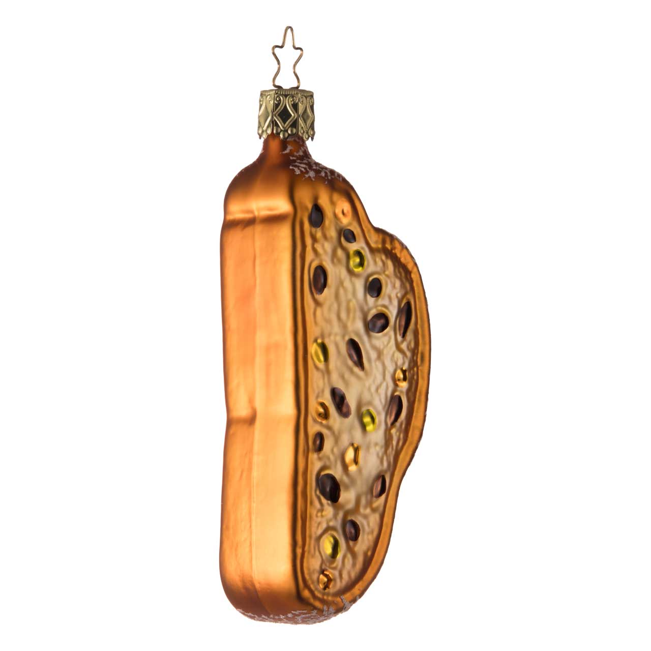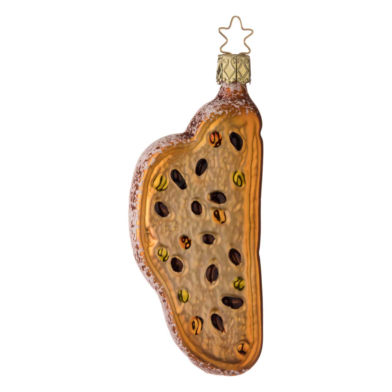 La pallina ha la forma di un pezzo di stollen tagliato e colpisce per i toni caldi dell'oro e del marrone e per la superficie leggermente "confettata". La superficie di taglio chiara è decorata nei minimi dettagli con pezzi di frutta scuri e giallastri, che rendono la statuetta particolarmente vivace e appetitosa.