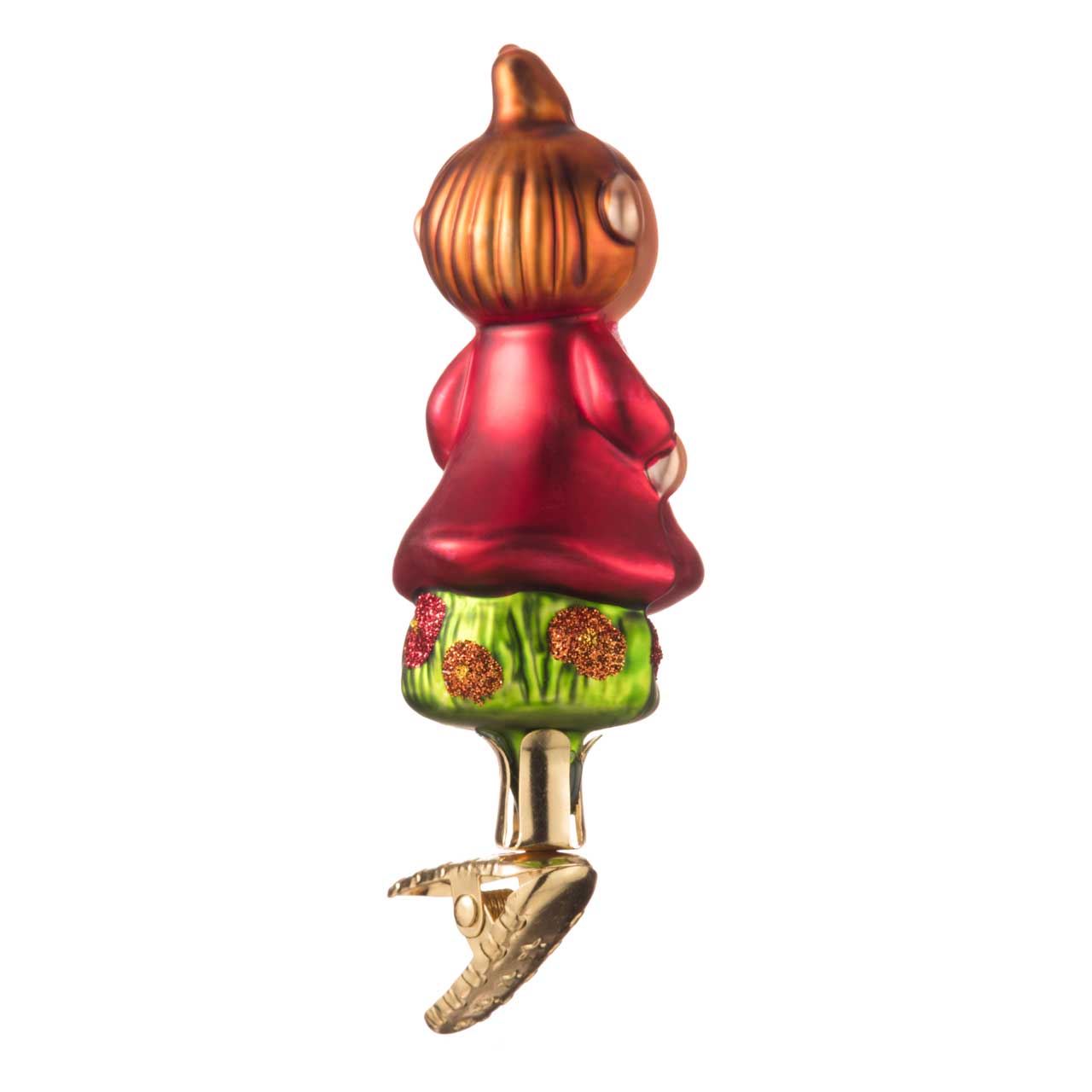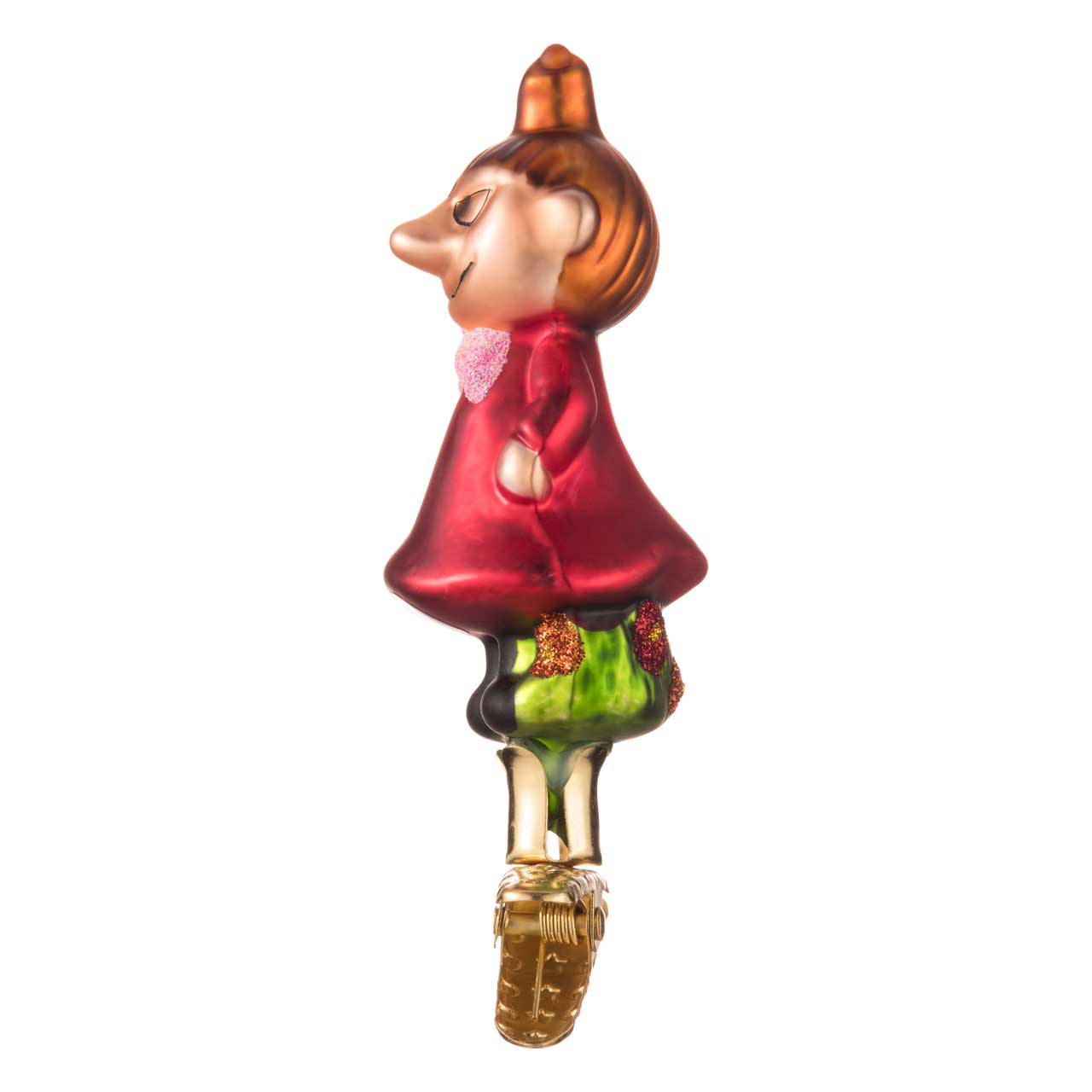 Il mondo dei Moomins è caratterizzato da oltre 100 personaggi diversi. Tuttavia, le figure più importanti sono i membri stessi della famiglia Moomin e alcuni personaggi di spicco dell'ambiente circostante. Ammirate qui: Little My, o Piccola Mia - una bambina piccola e sfrontata, nota anche per la sua lealtà e il suo coraggio. Si erge energicamente sul ramo di abete come figura a clip e attira l'attenzione di tutti con la sua caratteristica acconciatura a coda di cavallo e il suo vestito rosso brillante.