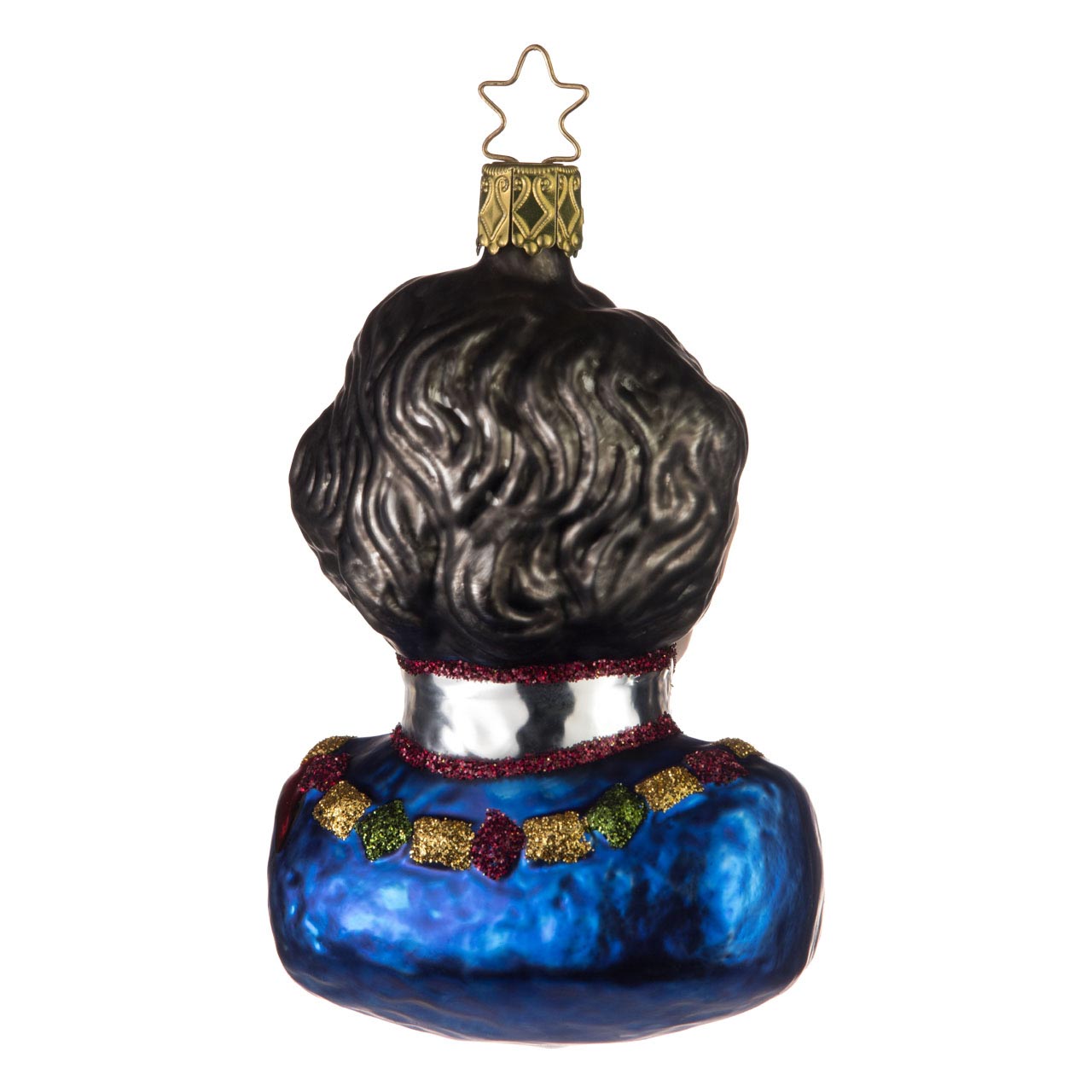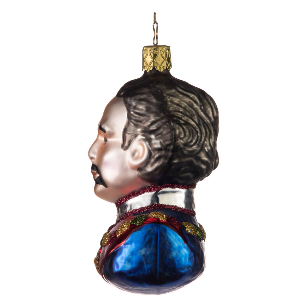 È giunto il momento di erigere un monumento allo stesso entusiasta mecenate della cultura e dell'estetica architettonica, sotto forma di un piccolo e raffinato busto per l'albero di Natale. Naturalmente, la giacca dell'uniforme reale è blu e la fascia obbligatoria è rosso cremisi. La maestosa collana con una stella d'oro sul petto scintilla d'oro, rosso e verde. Anche il viso colpisce per gli occhi delicatamente dipinti e la tipica barba accuratamente rasata. Senza dimenticare la chioma castana, leggermente ricurva, che gioca intorno alla testa di Ludwig.