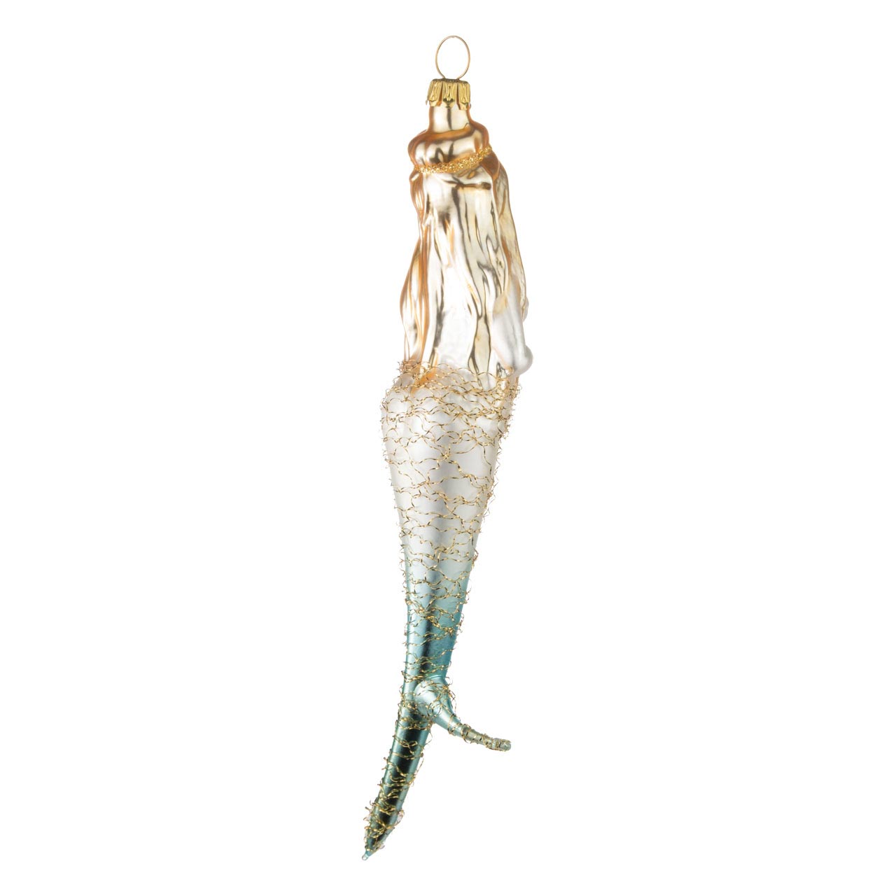 Come una polena sulla prua di una nave, questa sirenetta adornerà elegantemente anche il vostro albero di Natale. Non sono solo il colore e il design ad affascinare, con tonalità pastello opache e dettagli delicati. I lunghi capelli biondi scorrono rigogliosi intorno alla parte superiore del corpo nudo, mentre il nero bluastro scintillante è avvolto da un filo di ferro arricciato.