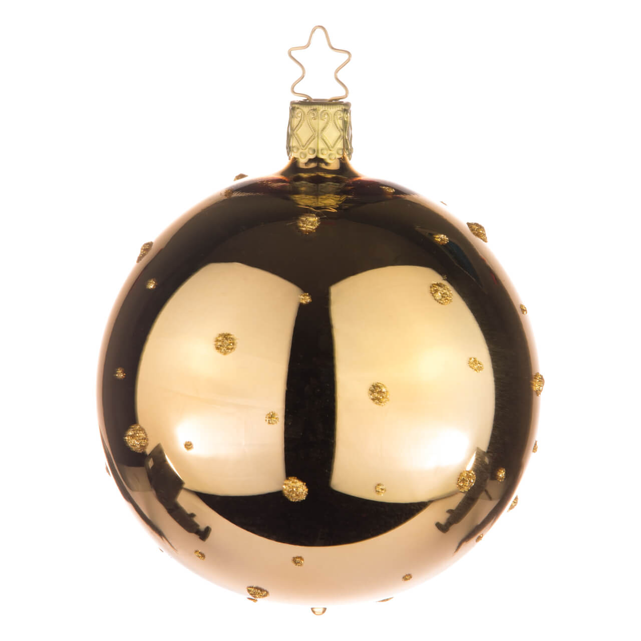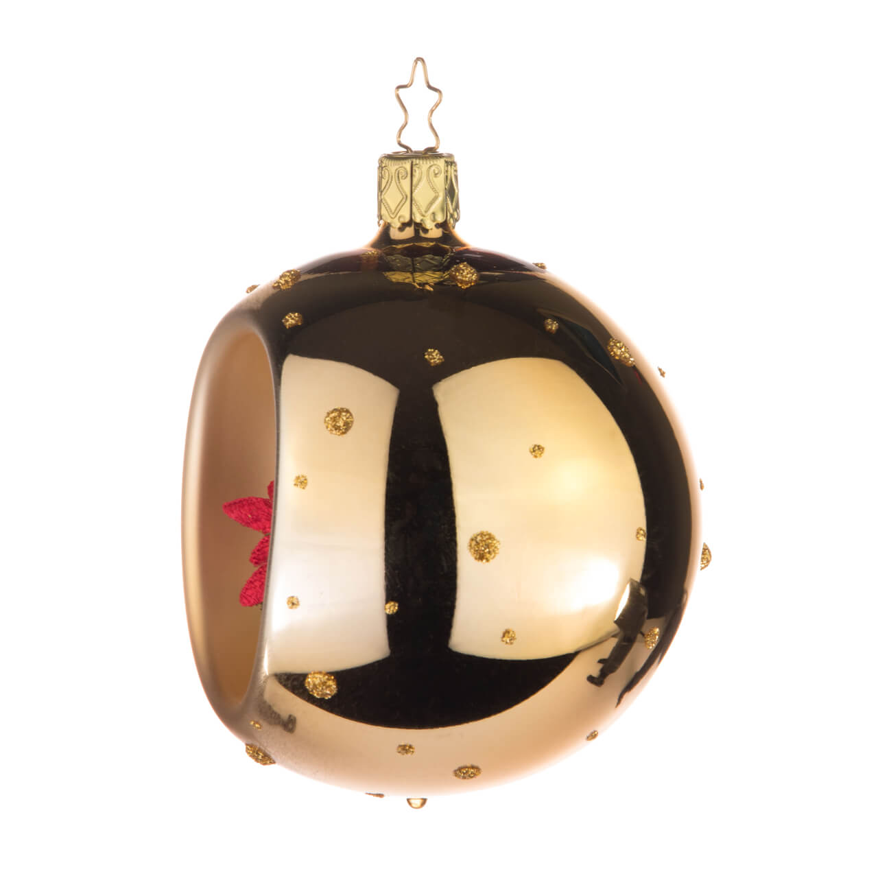 Una delicata stella di Natale rossa, leggermente pelosa e festosa, fatta di tessuto e filo di ferro, è stata abilmente incollata nella grotta opaca e scintillante. Mentre lo sfondo è semplice e sobrio, il piccolo fiore con le sue foglie verdi scintillanti e le perline dorate scintillanti al centro attira l'attenzione di tutti. Il gioiello è anche elegantemente incorniciato dal suo involucro: a seconda della versione, la sfera riflettente è stata dipinta in un colore vivace e amorevolmente tamponata con piccoli e grandi punti glitter.