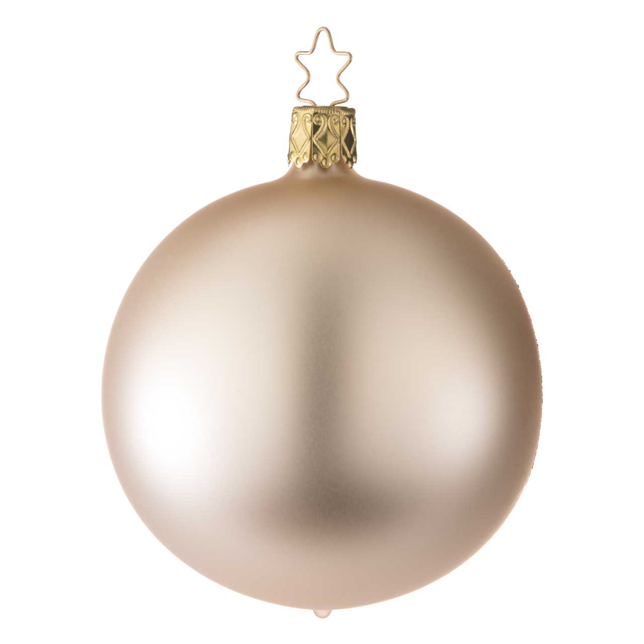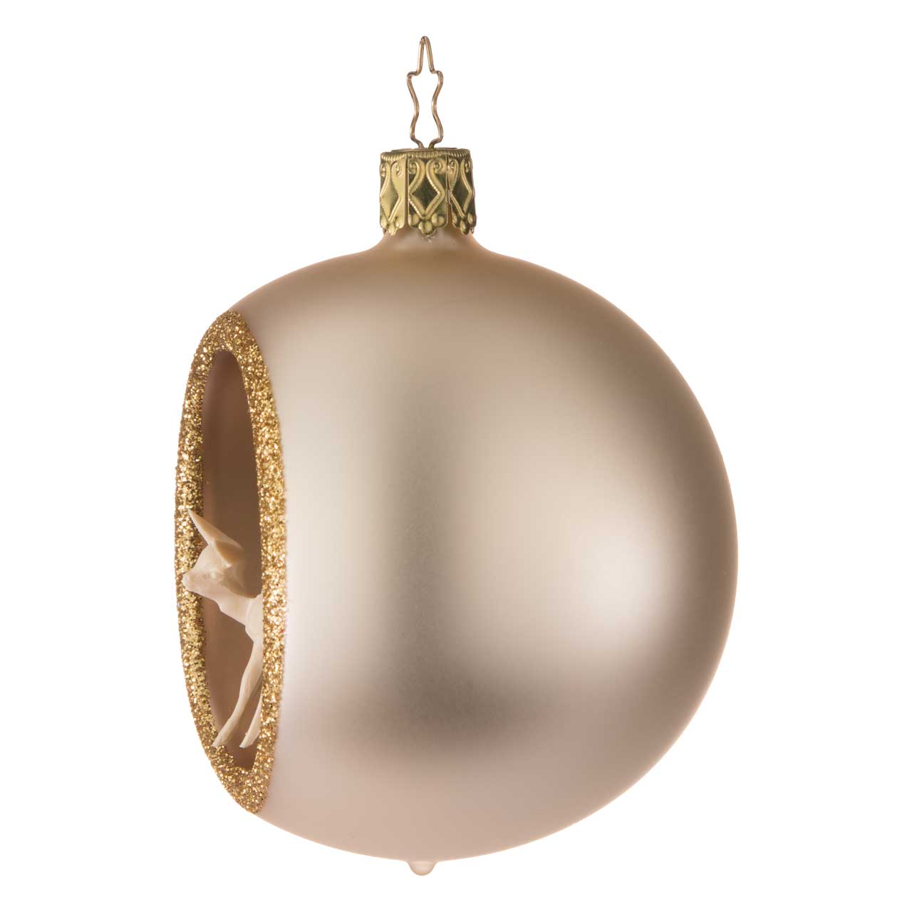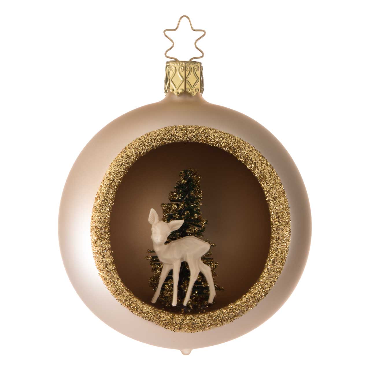 La sfera è classicamente rotonda e disegnata in un sofisticato colore champagne opaco. Un'apertura laterale con un bordo dorato scintillante permette di vedere la scena dettagliata all'interno: un delicato abete di colore scuro e un delicato cervo di colore chiaro. La statuetta ha un aspetto elegante, tranquillo e di alta qualità: un piccolo e suggestivo panorama invernale in armoniose tonalità naturali e dorate.