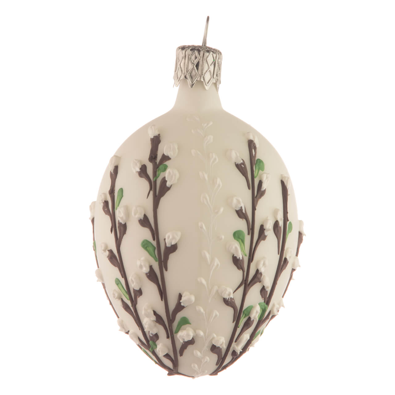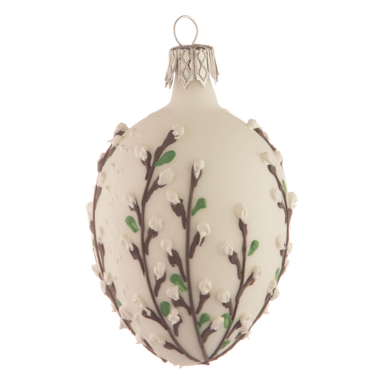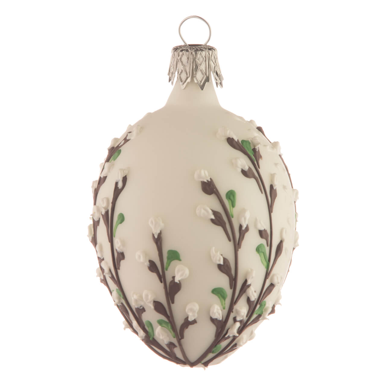 Filigrana dal laboratorio di uova di Pasqua: Delicati e fini, si arrampicano verso l'alto - i rami di salice su uno sfondo bianco opaco. Spuntano dalla punta dell'uovo di vetro rivolta verso il basso, in una danza circolare, con i rami più piccoli posizionati al centro e quelli più lunghi all'esterno.