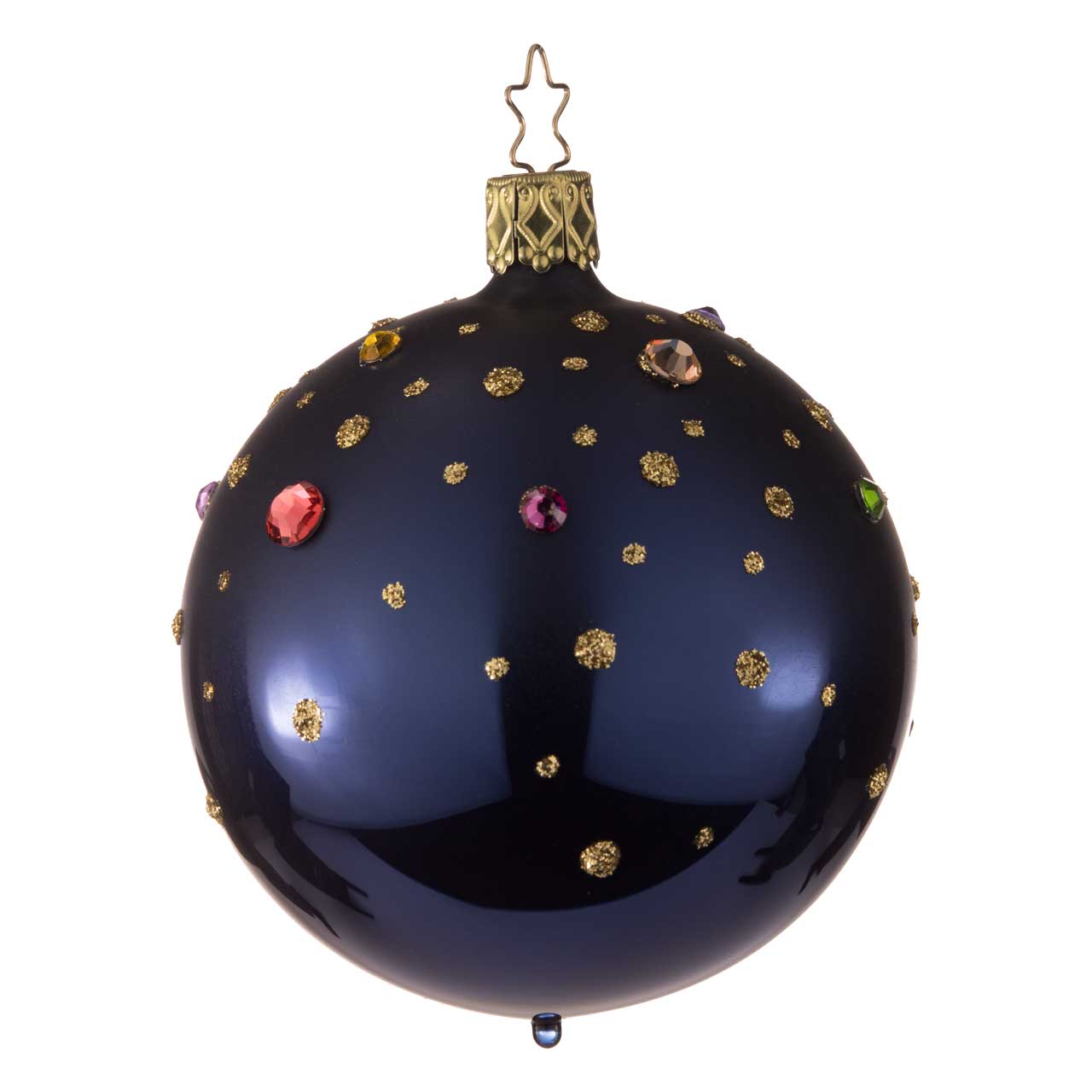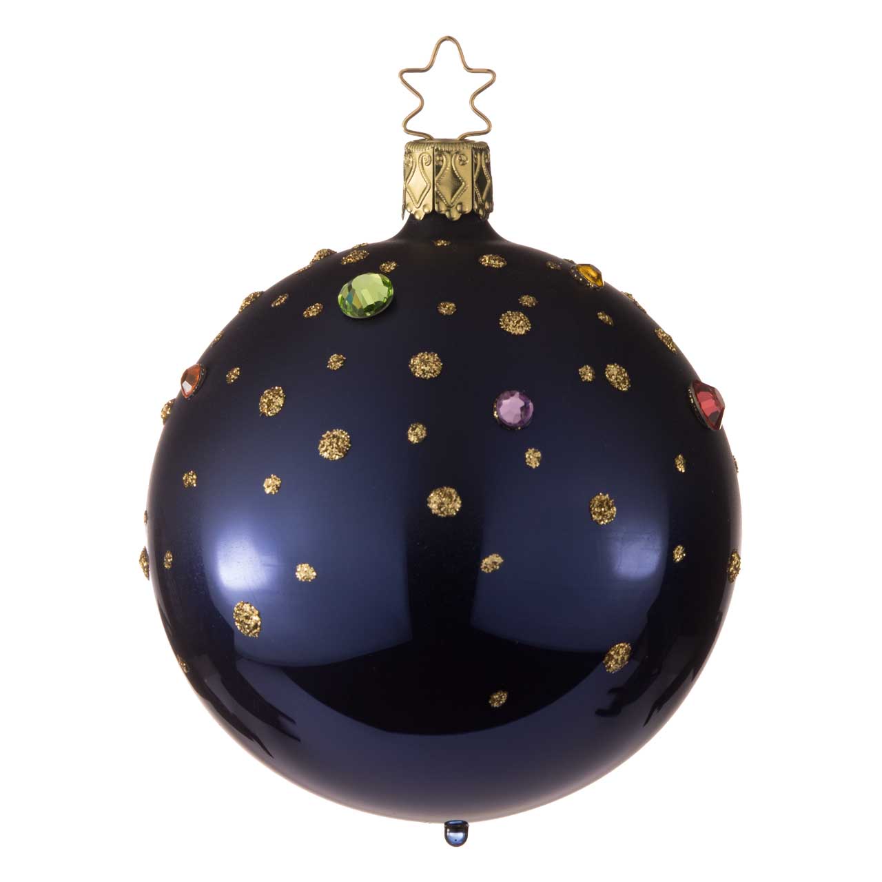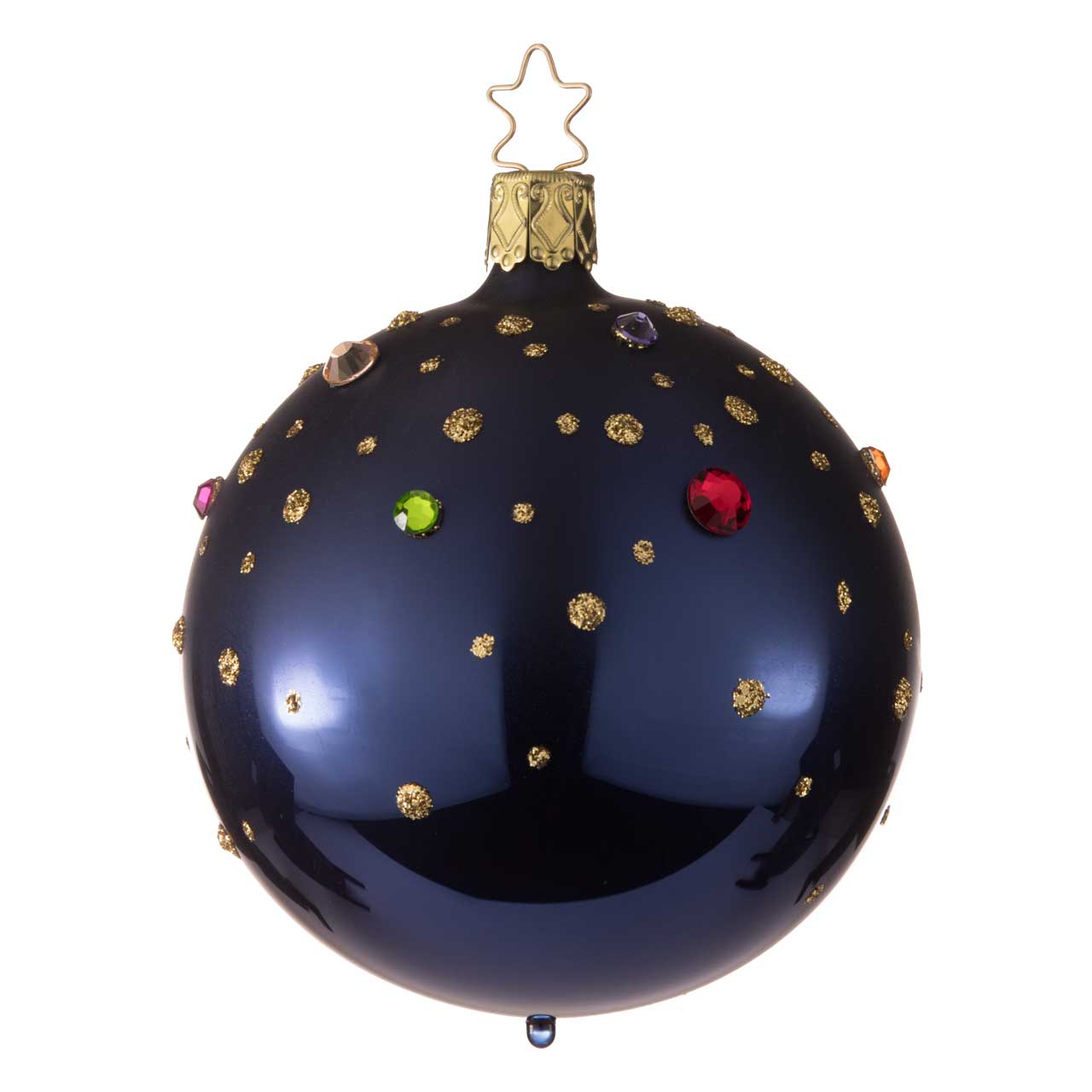 La sfera ha una classica forma rotonda ed è di un profondo ed elegante colore blu notte. I puntini dorati ricordano le stelle, mentre le gemme colorate incorporate in rosso, verde e viola forniscono ulteriori accenti scintillanti. La statuetta ha un aspetto elegante e misterioso e aggiunge un tocco di magia stellare a qualsiasi decorazione.