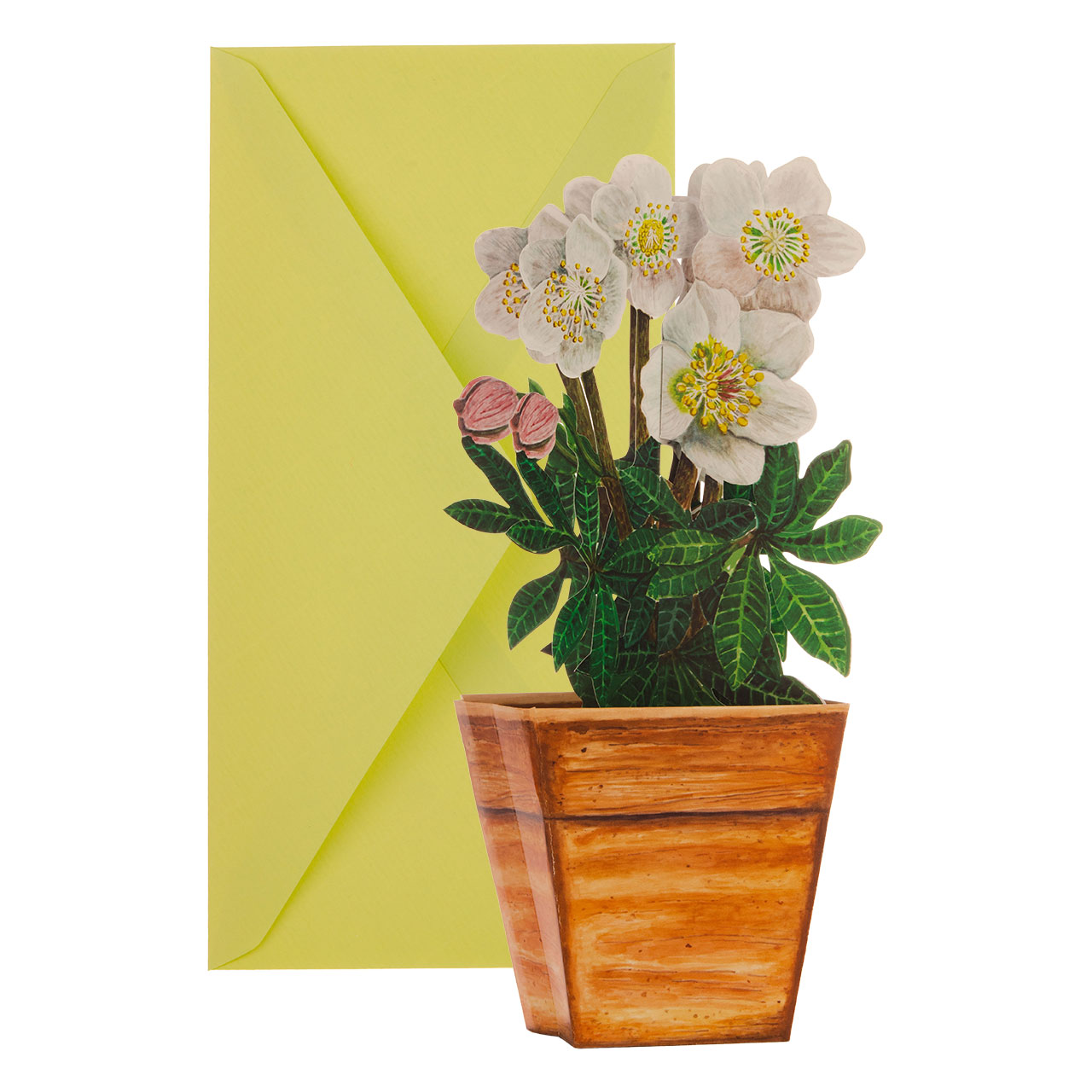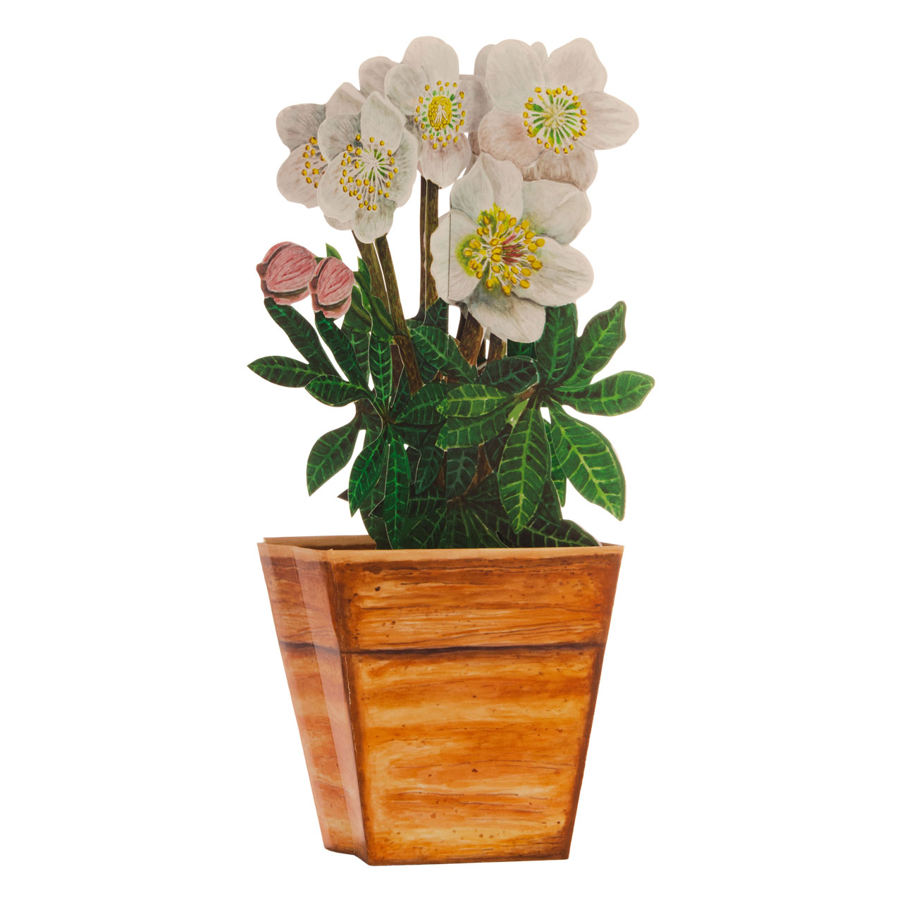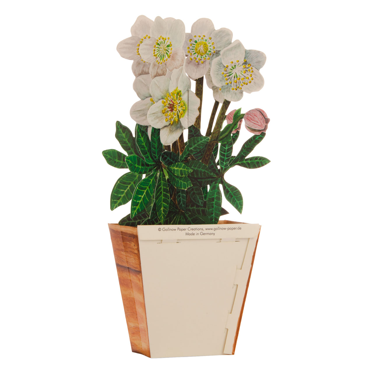 D'altra parte, la carta robusta e stampata a colori può essere facilmente dispiegata in un'opera d'arte piccola ma di grande effetto. La base è costituita da un vaso da fiori marrone argilla screziato a forma di cuboide che si restringe verso il fondo. Piantata nel terriccio marrone, sopra di essa si presenta una rosa di Natale dalla fioritura rigogliosa, con bellissimi fiori bianco-gialli e le caratteristiche foglie verdi a forma di dito. Posizionato sul tavolino o sul davanzale della finestra, questo omaggio floreale non solo rallegrerà le buie giornate invernali, ma ricorderà a lungo le simpatiche righe per le quali è previsto uno spazio bianco libero sul retro del vaso.