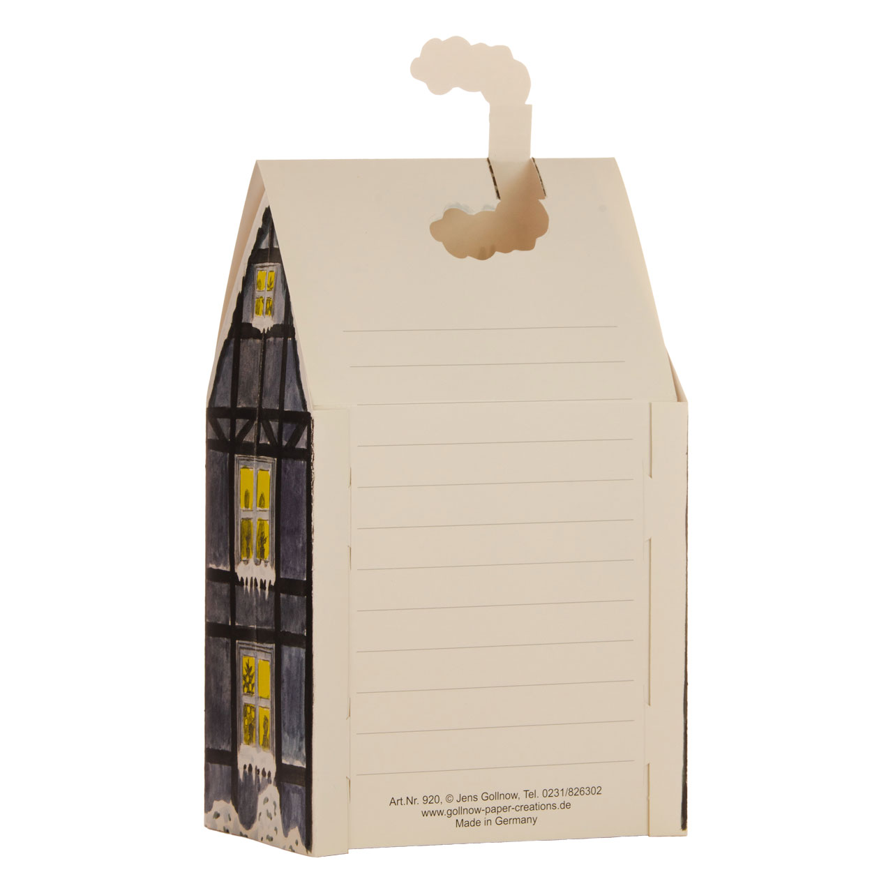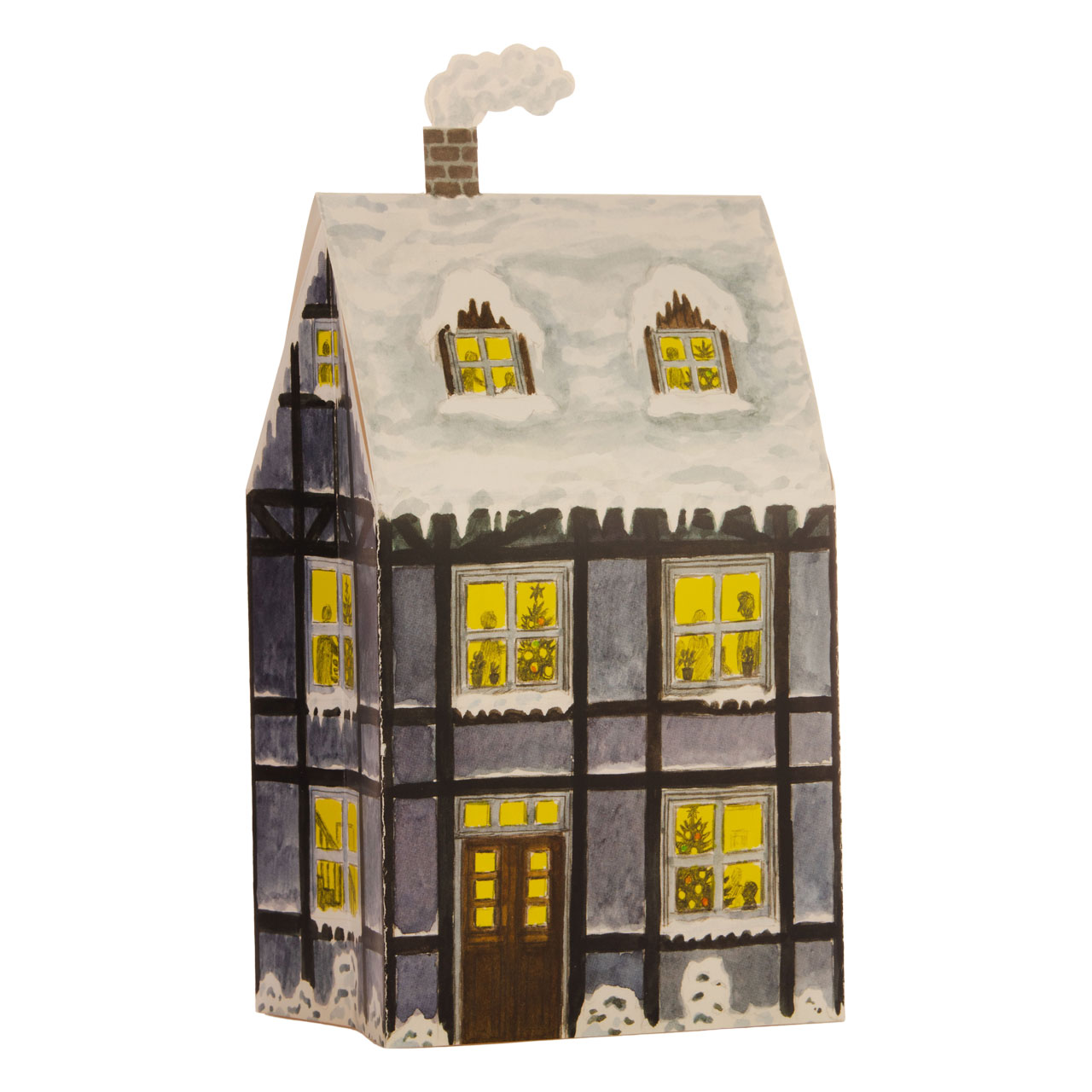 Anche voi amate passeggiare per le strade nel freddo gelido dell'inverno e dare un'occhiata qua e là alle finestre delle case illuminate in modo caldo, da cui si irradia puro benessere? Naturalmente, tutto ciò è più bello a Natale, quando gli alberi di Natale decorati a festa scintillano nei salotti accoglienti e le famiglie si riuniscono in allegra compagnia. Questa cartolina porta una scena del genere sulla carta spessa e stampata a colori, che può essere dispiegata in una maestosa casa tradizionale a graticcio a tre piani in pochi semplici passi. La neve si accumula sul tetto e sui davanzali delle finestre, il fumo denso esce dal camino, mentre le finestre spruzzano luce gialla e rivelano momenti natalizi. Un oggetto decorativo che può essere appoggiato sul tavolino o sul davanzale della finestra e che sicuramente rallegrerà non solo le buie giornate invernali; le simpatiche righe, per le quali è previsto uno spazio bianco e foderato sul retro della casa, possono essere lette più volte e quindi saranno sicuramente ricordate più a lungo.